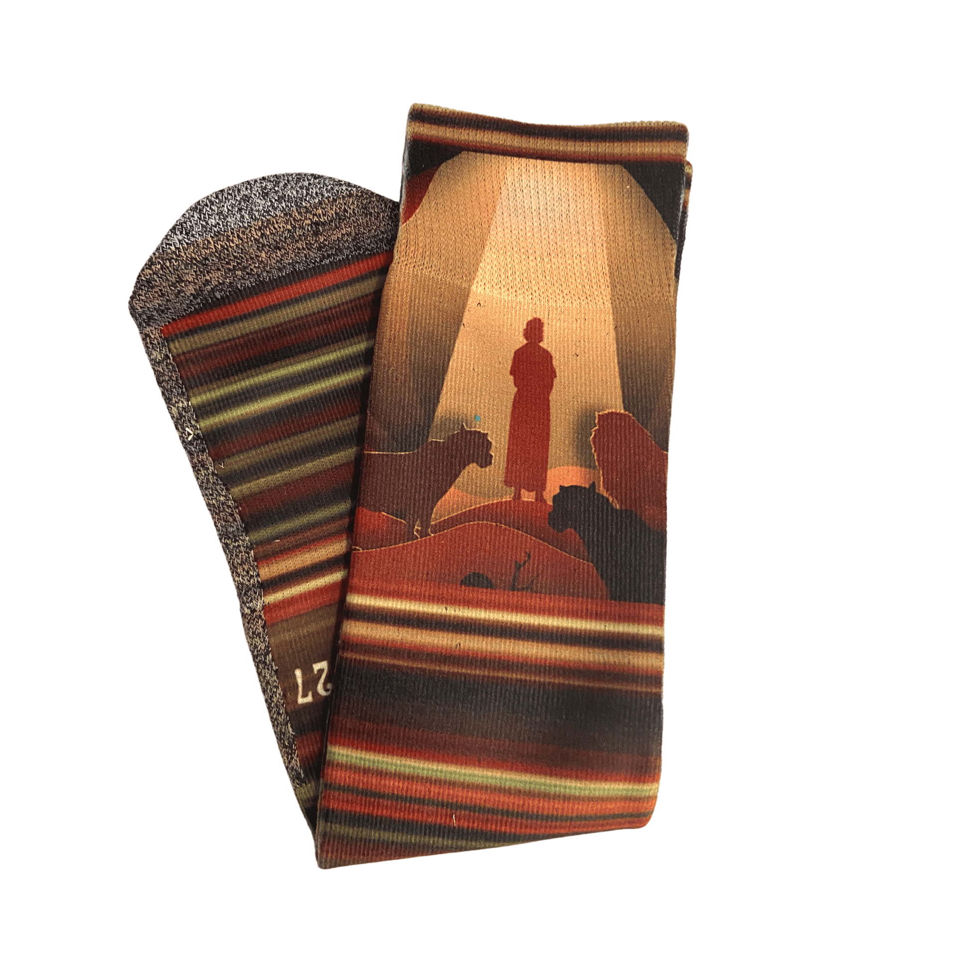 Experience biblical comfort and confidence with "Daniel & The Lions' Den" BibleSocks. These Christian socks will help you have the courage to do anything you need, whether it be going back to church or asking the new member out on a date. "He delivers and rescues, and he works signs and " (Daniel 6:27)