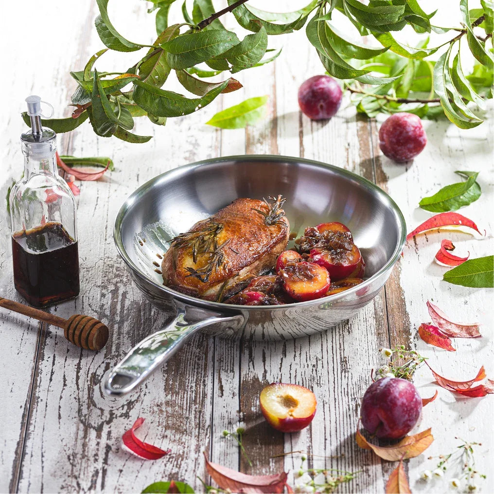 Sauces are essential in cooking. They will intensify flavors, add moisture and visual appeal to your dishes. This is why we created that unique rounded shape of the pan to facilitate whisking and stirring that are necessary to cook the most delicate and tasty sauces.