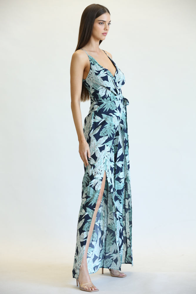 Jumpsuit- Leaf/palm Print Pattern All Throughout- Surplice, V-neckline- Adjustable Shoulder Straps- Surplice, Wrap Tie Pants- Zipper Back Closure- 65%cotton, 35%polyesterSize And Fit- Model Wears A Small- Model: 5'6