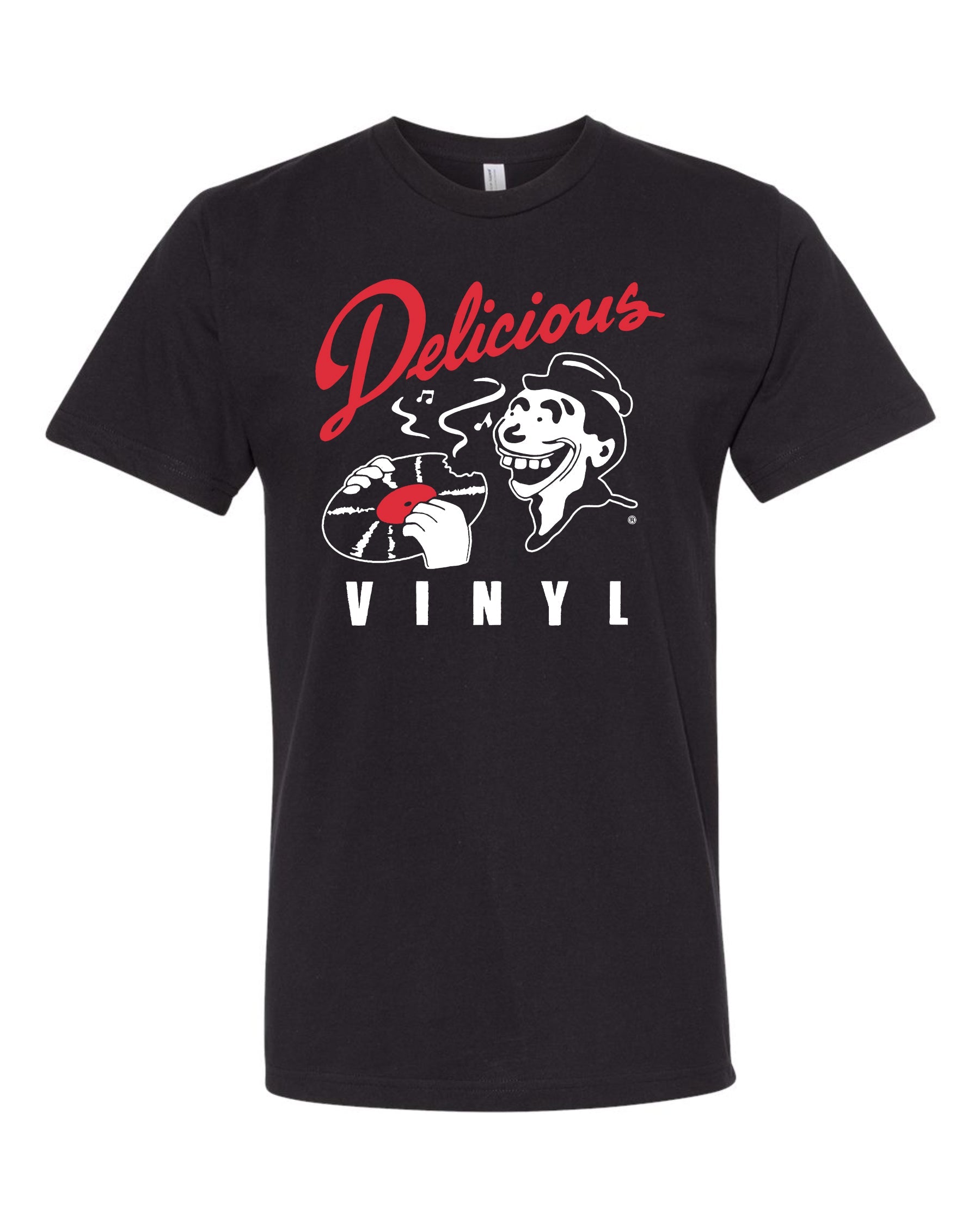 The classic Delicious Vinyl logo printed on American Apparel Fine Jersey T-Shirt - 2001W. 4.3 oz., 100% combed ringspun cotton, shoulder-to-shoulder taping, 7/8" seamed collar, 1" double-needle sleeve and bottom hem.