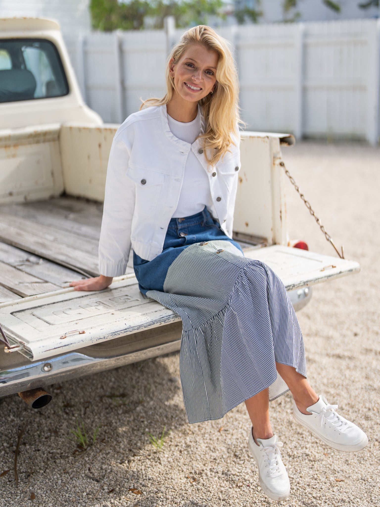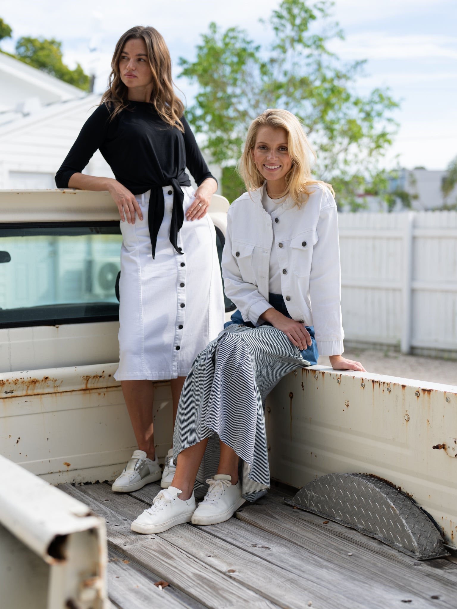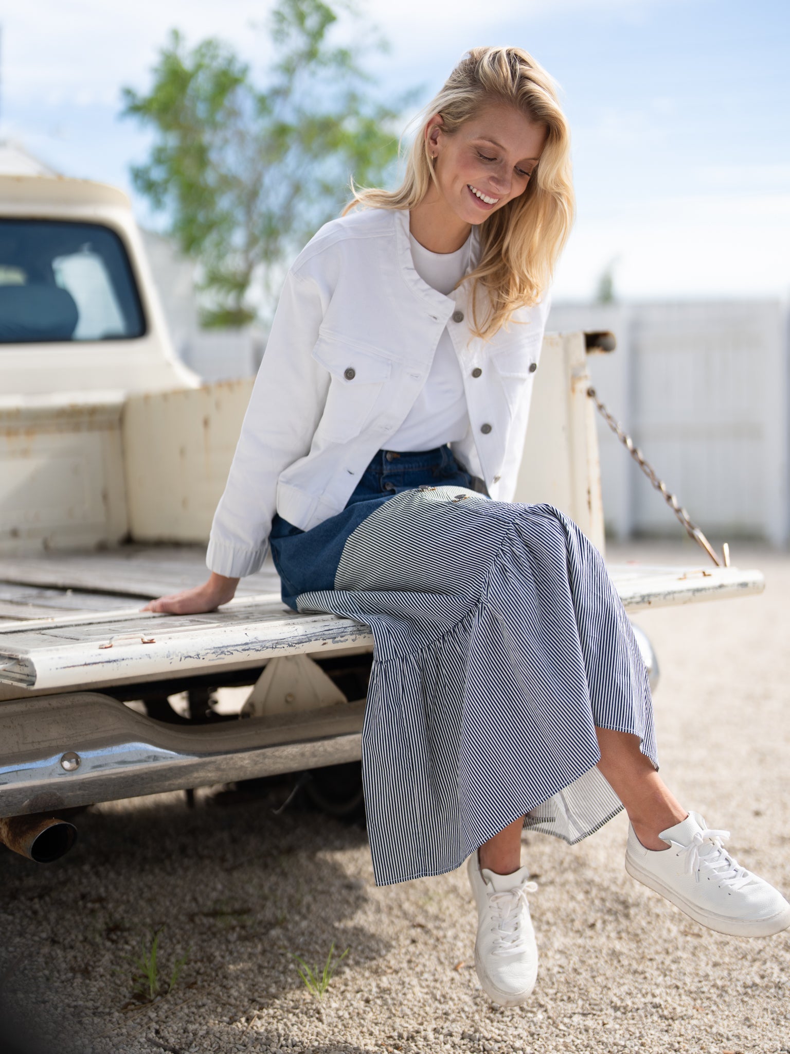 This DENIM STRIPE COMBO SKIRT is a fashion-forward statement piece. It is made from lightweight denim fabric for an easy to wear feel and has a unique stripe panel design. A great go to for any occasion.