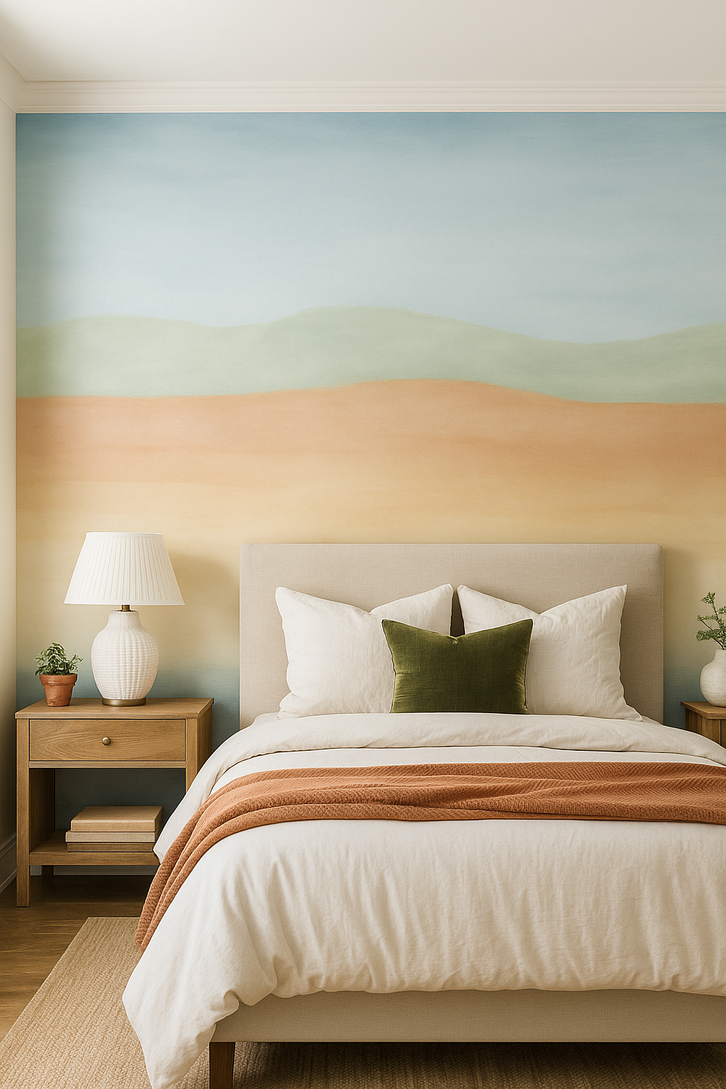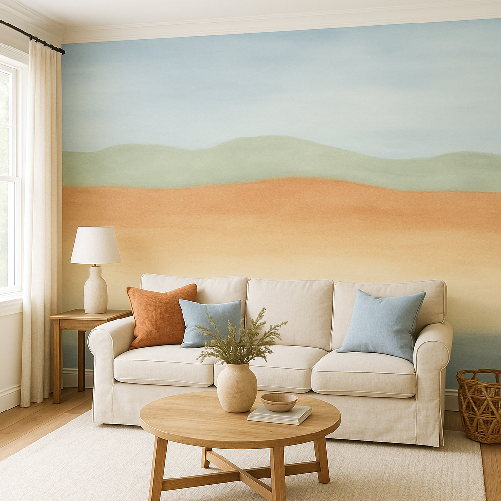 Desert Horizon Wallpaper captures the layered beauty of desert landscapes with abstract horizontal bands in warm terracotta, sand, clay, and soft blush tones. This earthy design is ideal for modern organic, boho, or desert-inspired interiors, adding warmth and depth to living spaces. Perfect for anyone seeking desert wallpaper, modern abstract landscape wall coverings, earthy mural wallpaper, or southwestern-inspired wallpaper.