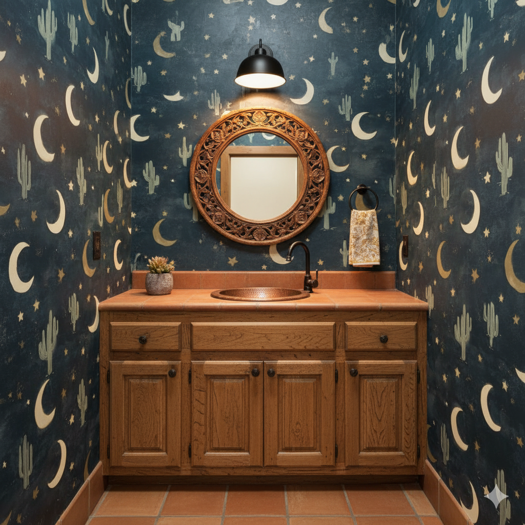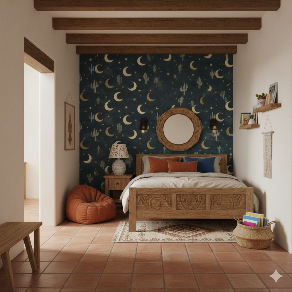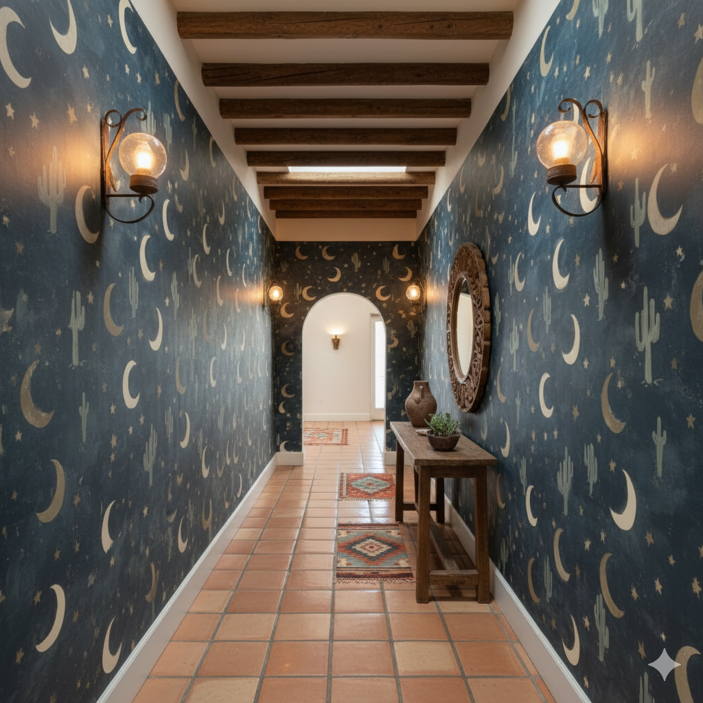 A whimsical nighttime desert scene with watercolor crescent moons, scattered stars, and saguaro silhouettes painted against a deep navy backdrop. The design captures the wonder of stargazing in the desert, balancing playfulness with serenity. Perfect for children’s rooms, eclectic bedrooms, or desert-themed Airbnb rentals, this wallpaper transforms walls into dreamscapes. It pairs well with gold accents, dark wood, or simple white furniture, making it versatile while still magical.