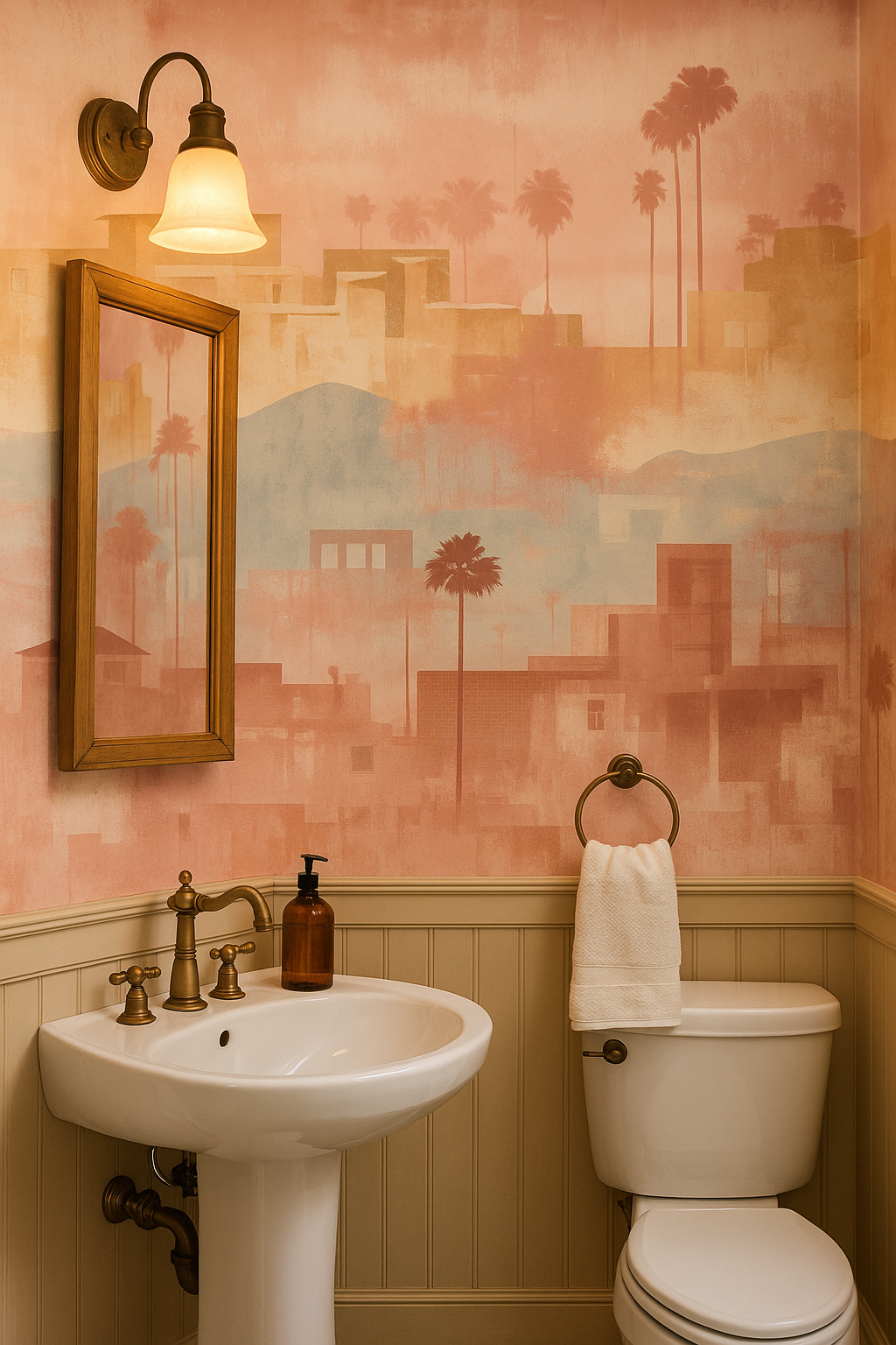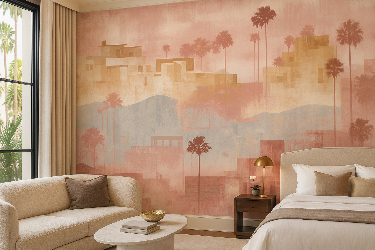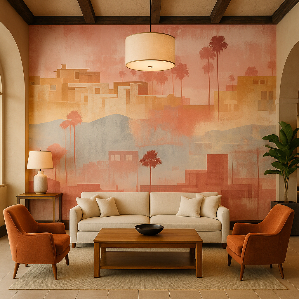 "Desert Mirage" drifts across the wall like a sun-faded memory—featuring softened architectural silhouettes, layered columns, and distant facades washed in sand, blush, and bone tones. The design mimics the feeling of desert heat and ancient ruins, offering subtle structure without harsh lines. Ideal for serene bedrooms, modern adobe spaces, or minimalist southwestern interiors craving warmth and quiet elegance.