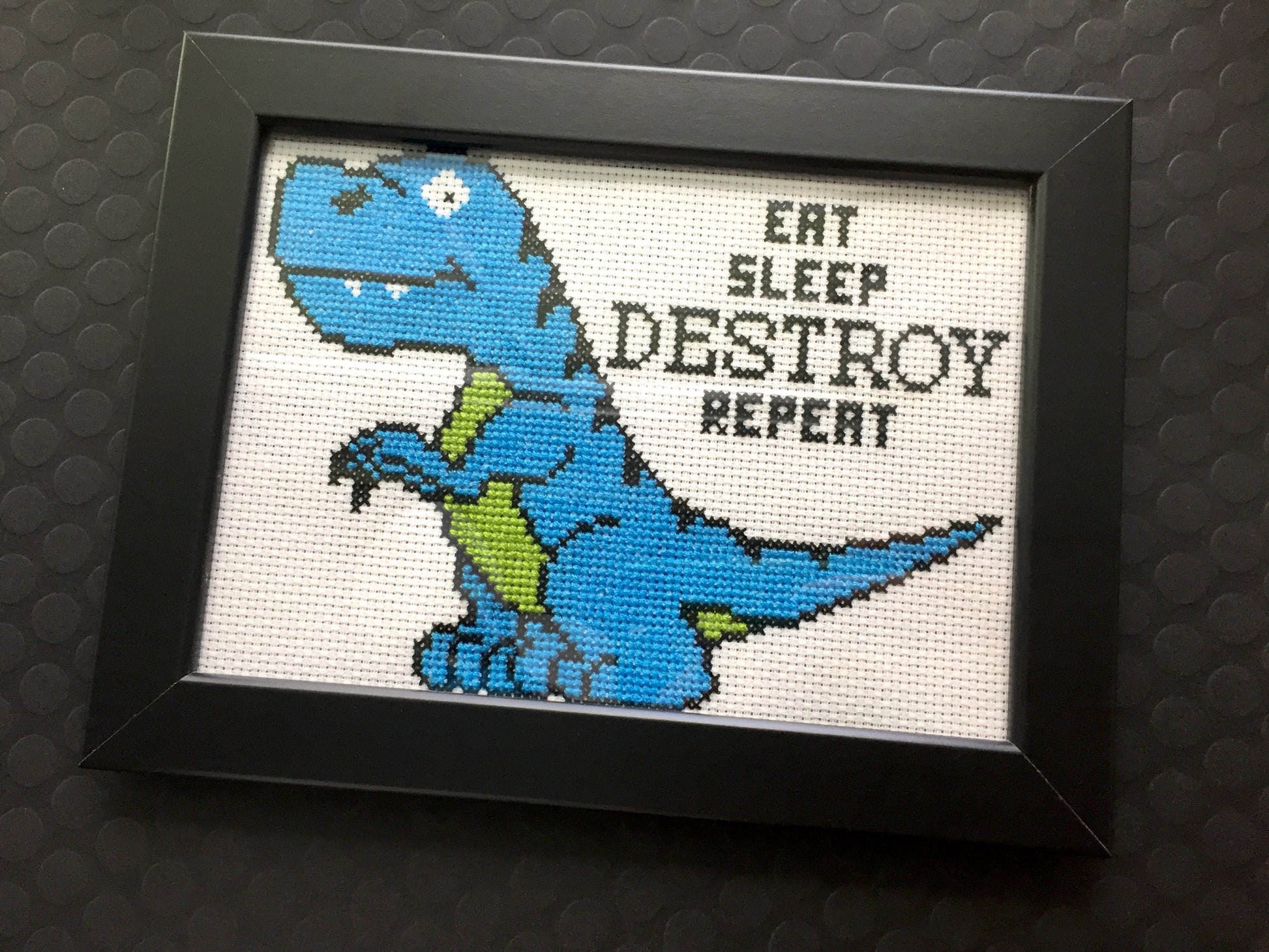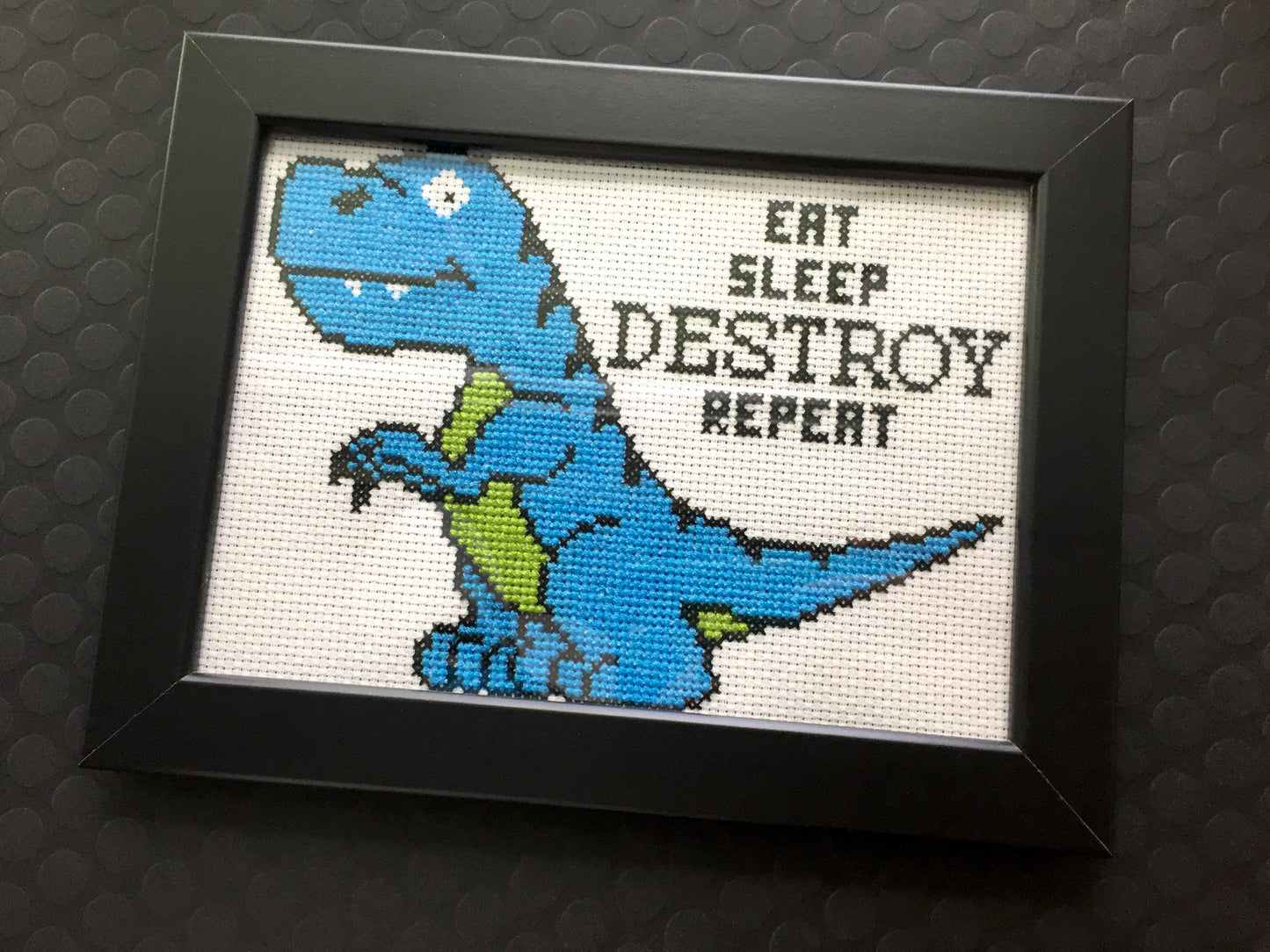 The design features a cute lil T-rex and the words "Eat Sleep Destroy Repeat".