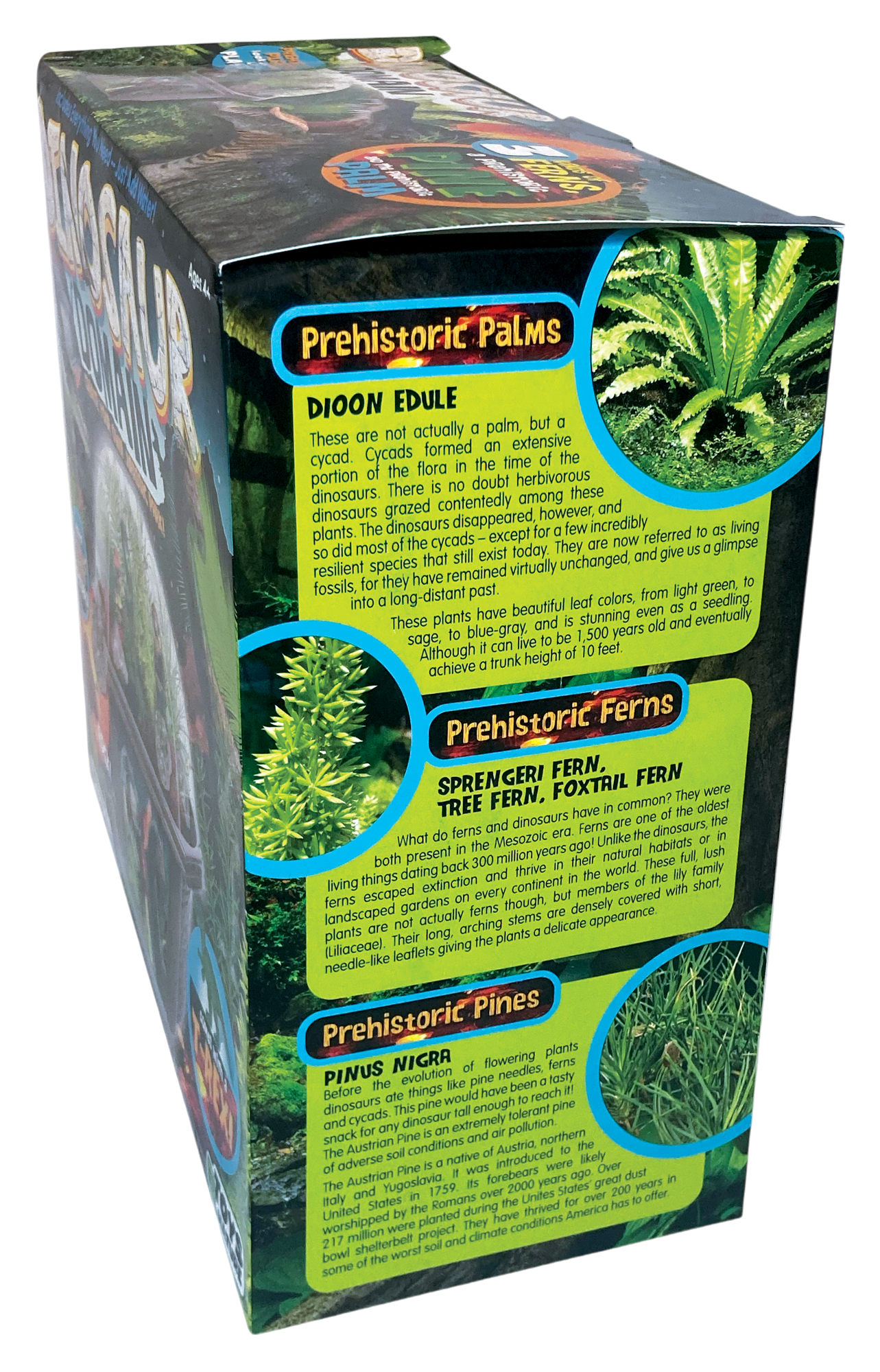 Create your own prehistoric Jurassic Park with the Dinosaur Domain. Grow prehistoric Pines, Ferns and Palms! These unique and fascinating plants are survivors and have remained largely unchanged since prehistoric times! Complete your Dinosaur Habitat with red Lava Rock, Metallic Calcite boulders, fun garden stakes and a huge Dinosaur Decal to make the perfect home for the included T-Rex!
