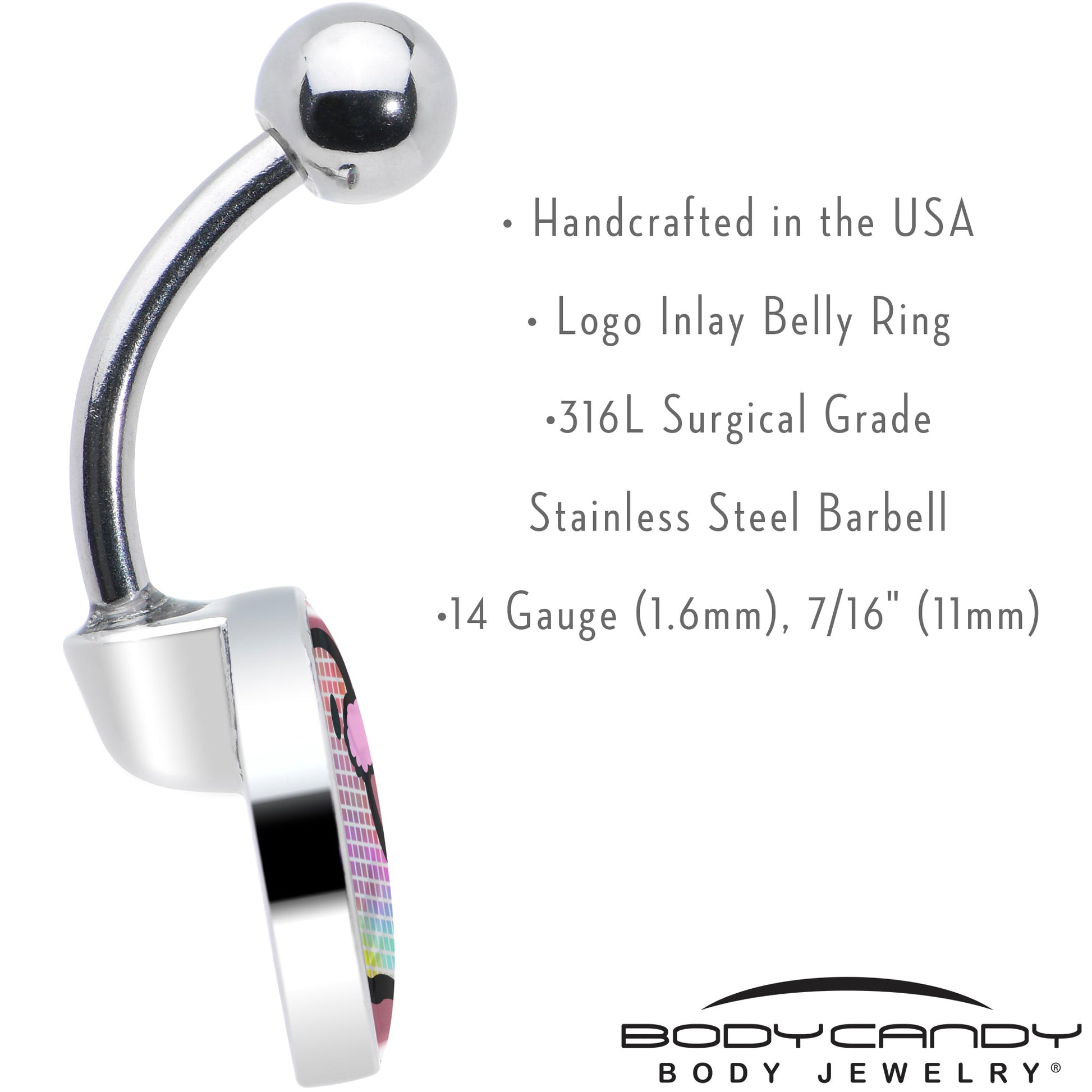 Get in the spirit to get groovy like the ghost on this 14 gauge stainless steel navel ring. It's made with a 7/16 inch 316L surgical grade stainless steel curved barbell with a 5mm top ball end. The bottom end features a purple disc logo charm with a holographic-style ghost whose sheet appears to feature a disco ball pattern. You'll be ready to rock like it's 1978 when you're sporting the spirit on this stainless steel belly piercing jewelry. Unique artist-drawn logo inlay design surgical steel belly button ring.