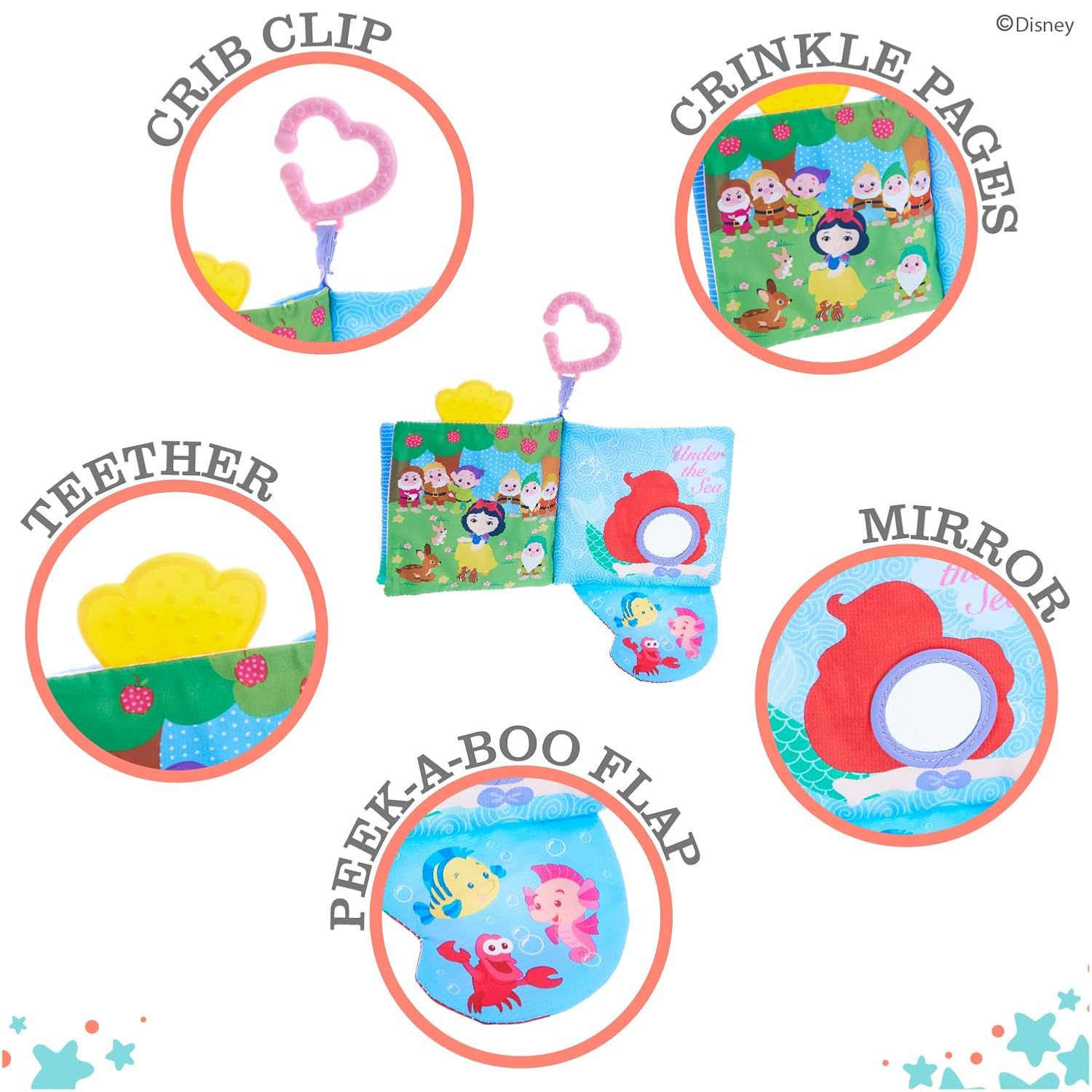 - Features teether, mirror, crinkly pages, and clip for easy attachment