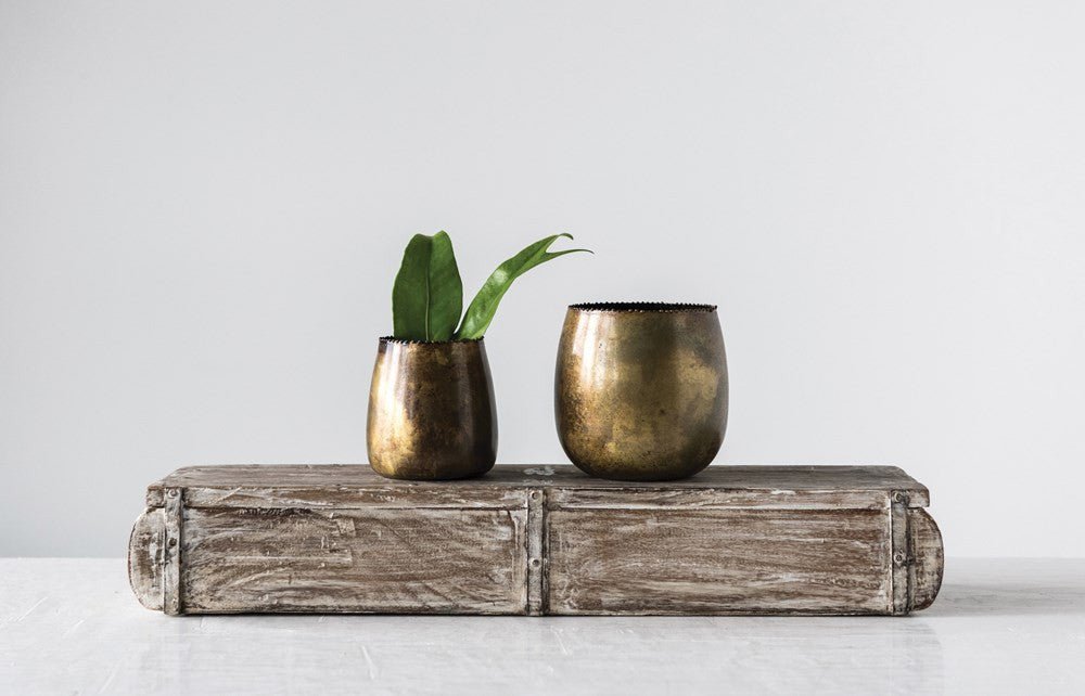 The distressed brass finish on these metal planters will add character to your home decor. Fill the planter with beautiful flowers or greenery and display on a shelf or tabletop. They can also be used as small metal storage bowls for items such as loose change, pens, or any small household or office necessities.