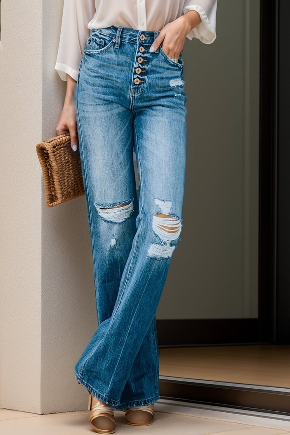 Upgrade your denim collection with our Distressed Button-Fly Jeans with Pockets. These trendy jeans feature a chic button-fly closure and strategically placed distressing for a lived-in, edgy look. The classic five-pocket design combines style with functionality, offering ample space for essentials. Made from high-quality denim, these jeans provide both comfort and durability, making them a versatile staple for any casual wardrobe.