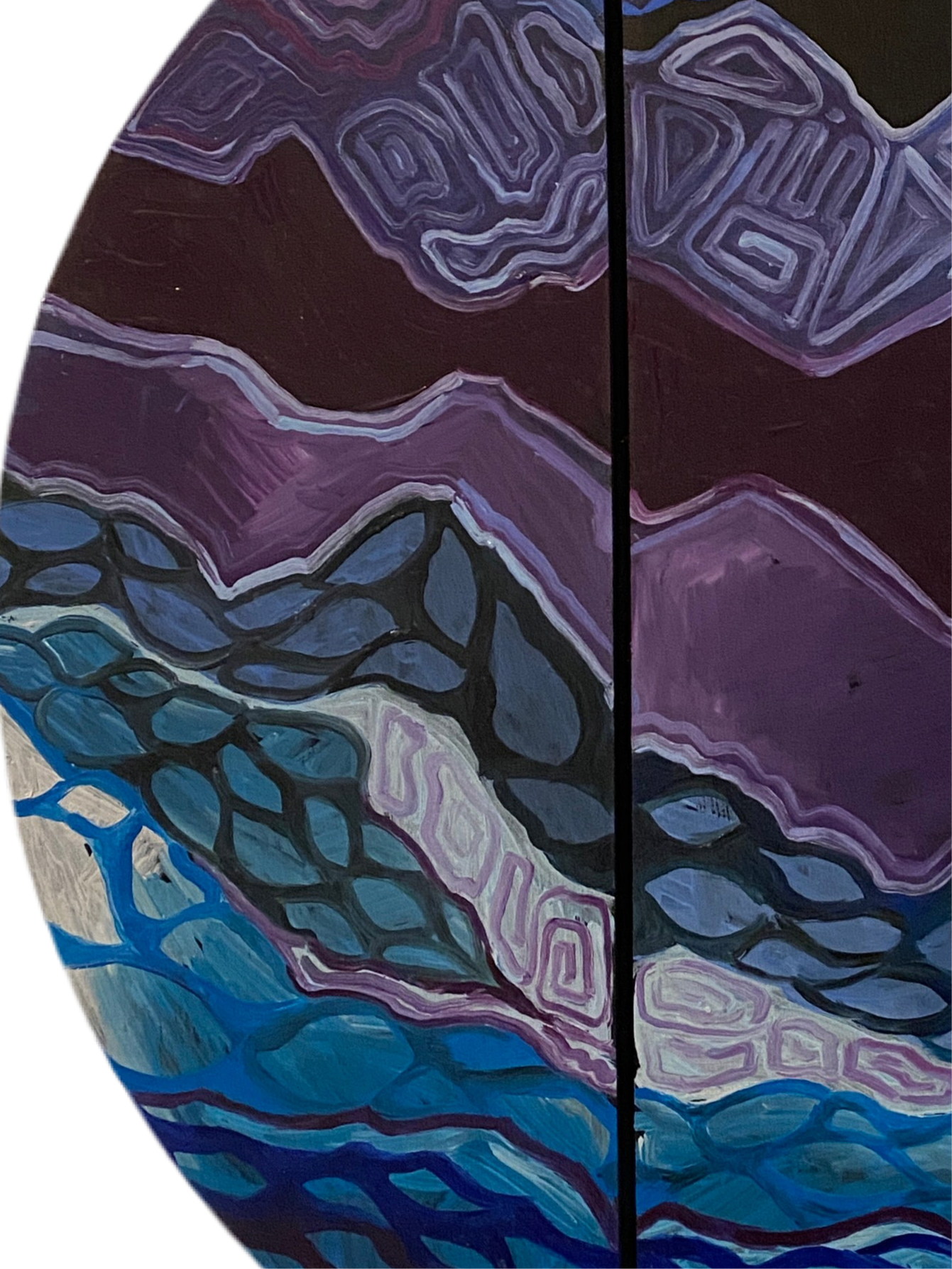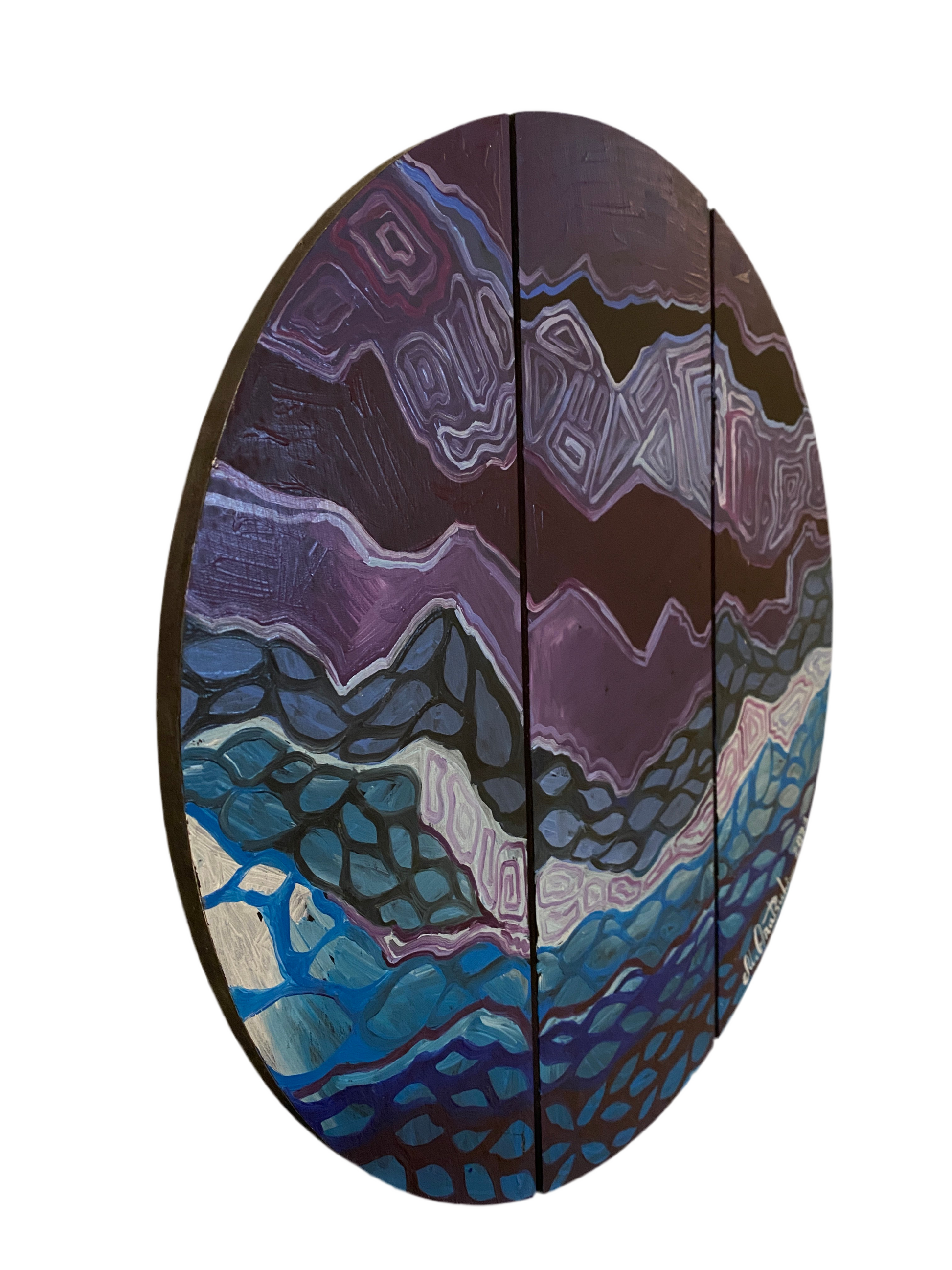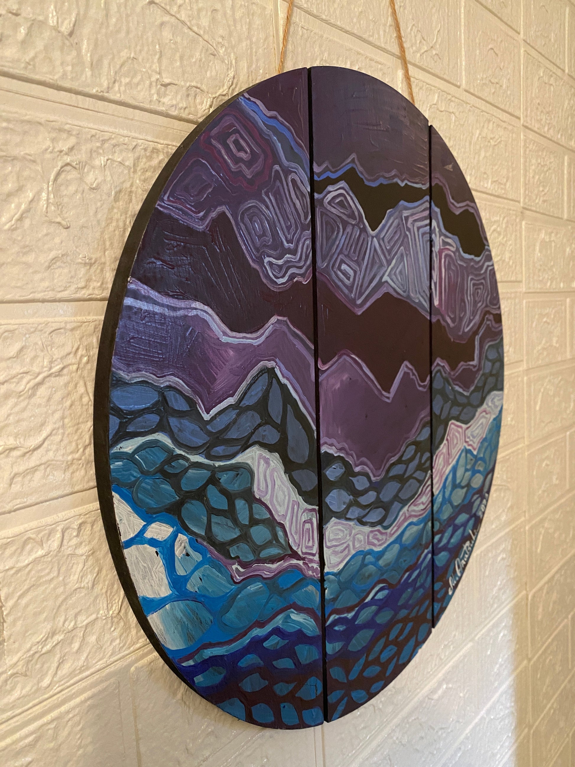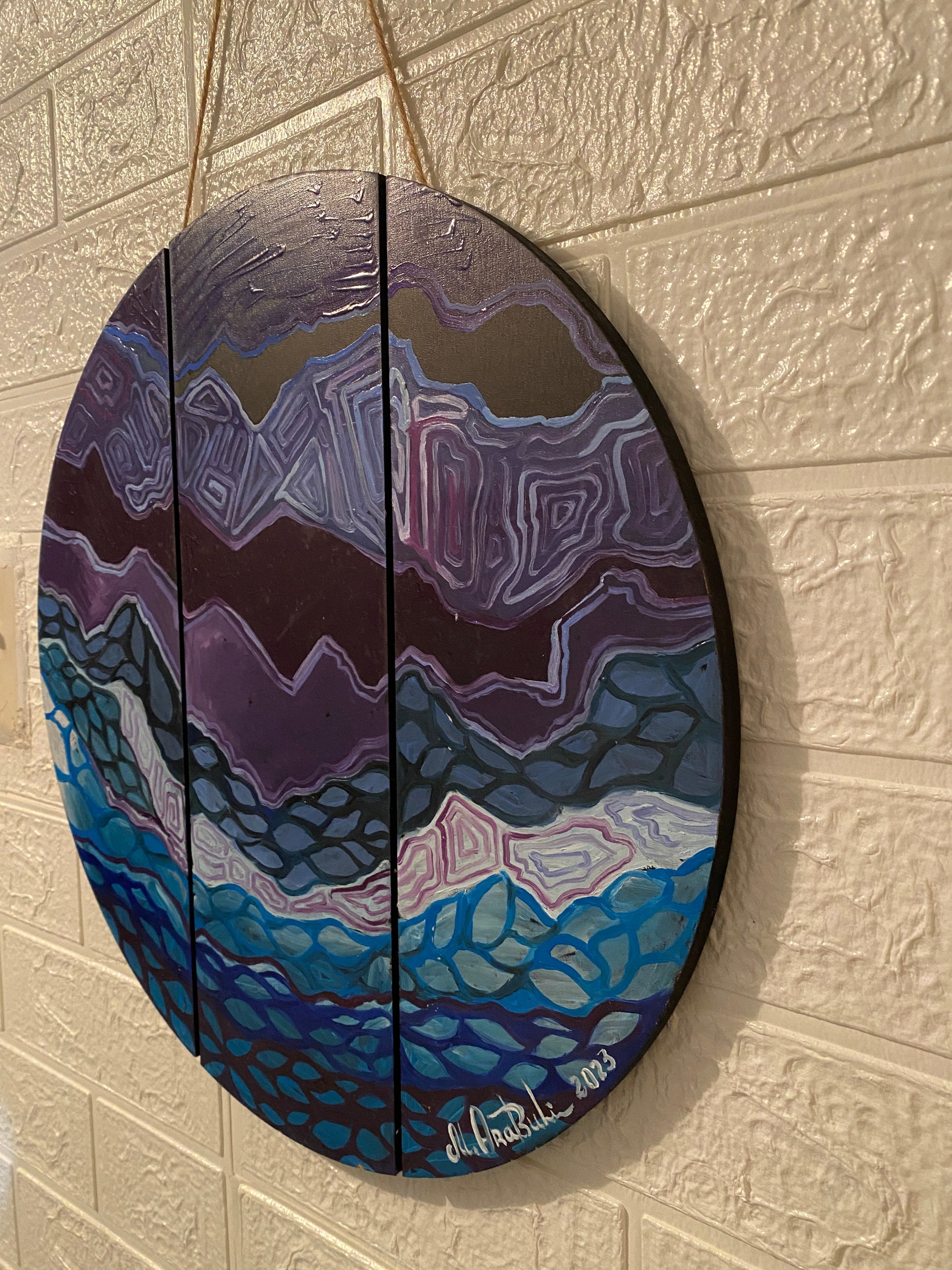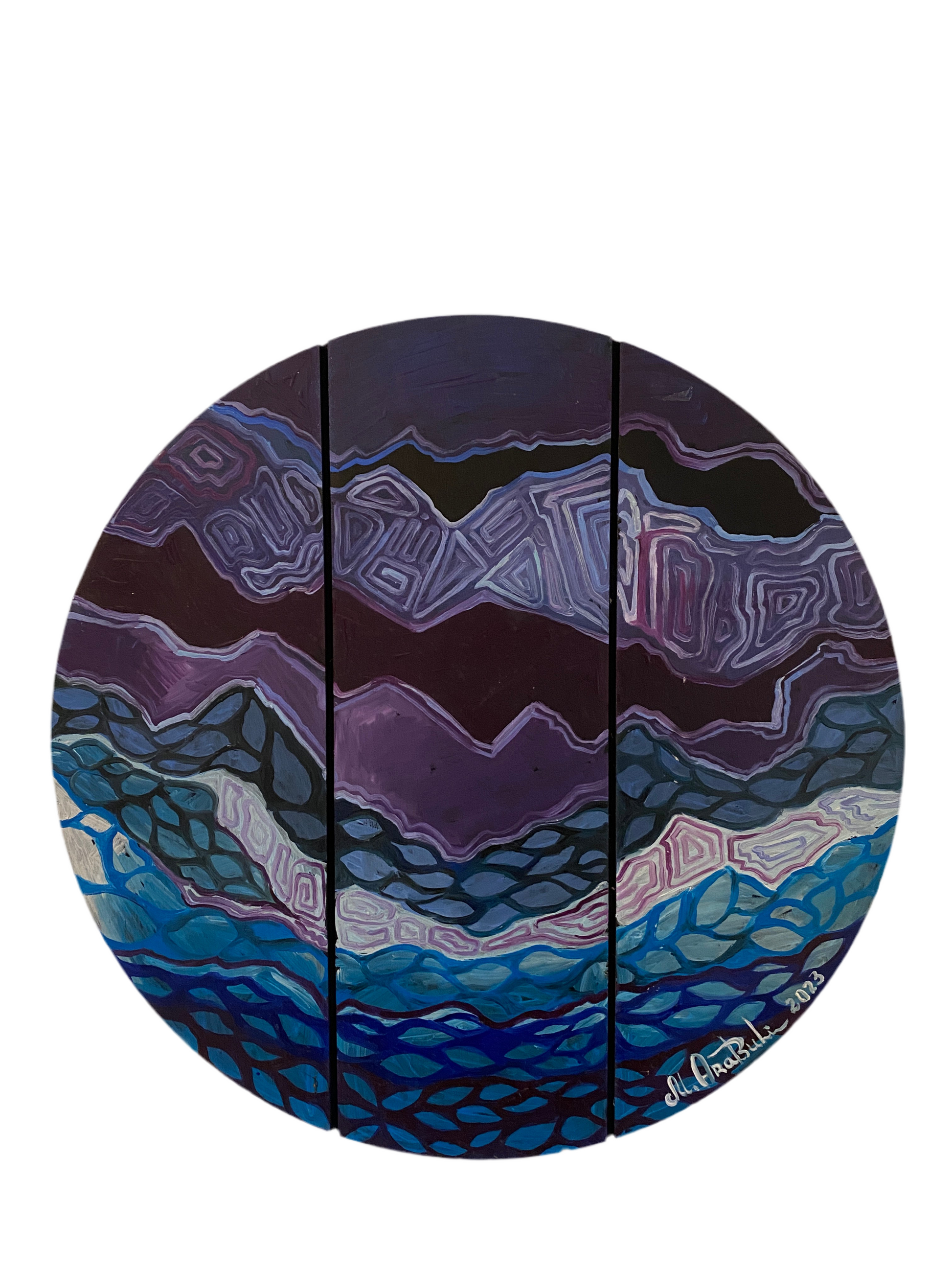 A mesmerizing abstract composition painted in deep purples, blues, and blacks, DNA of Universe explores the hidden patterns and rhythms of existence. This circular artwork is painted across three vertical wooden slats, adding a unique dimensional effect and enhancing its cosmic energy. The intricate, wave-like patterns evoke the strands of DNA and the vastness of the universe—where micro and macro worlds intertwine.
