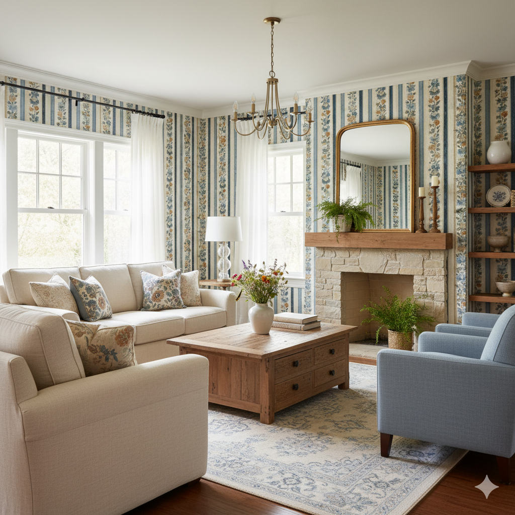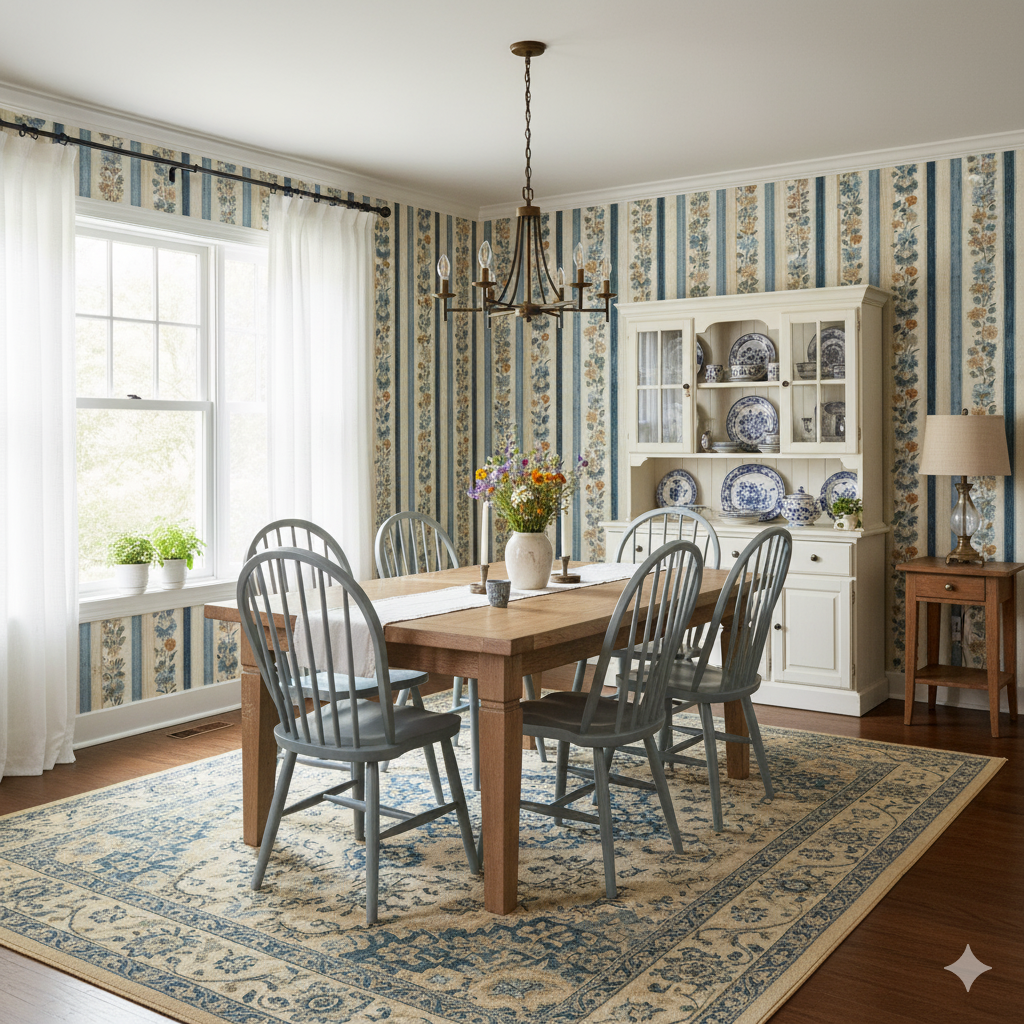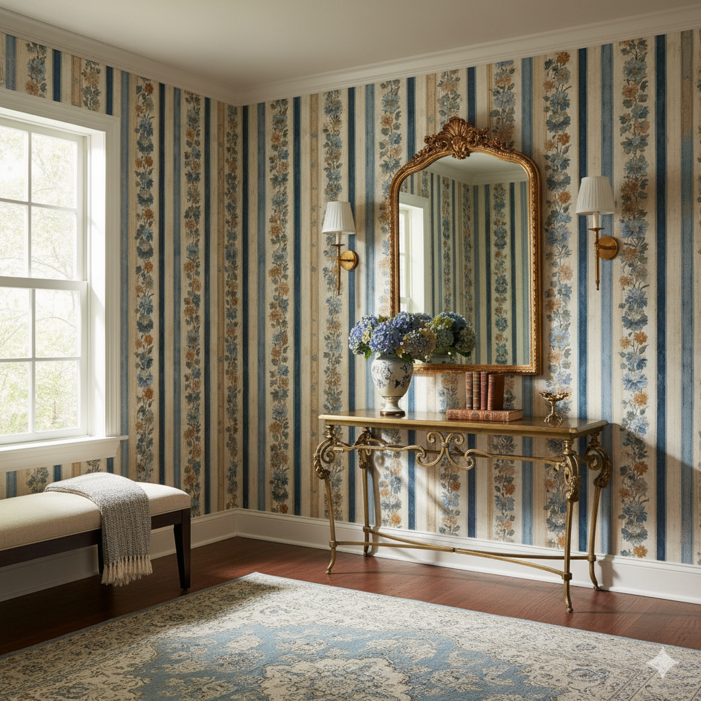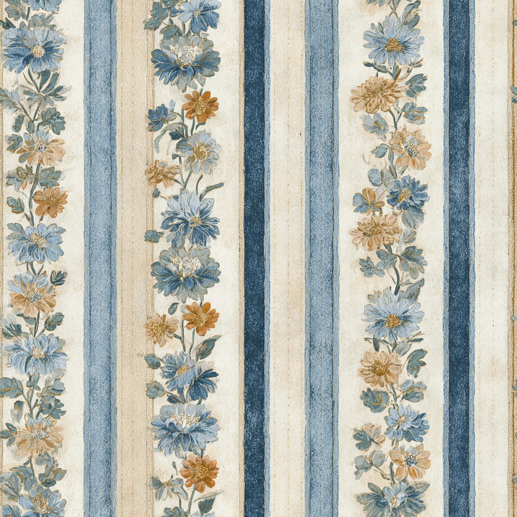 Vertical stripes in alternating shades of faded denim blue, sandy taupe, and ivory form the backdrop for delicate floral garlands climbing upward in rhythmic rows. Dockside Anthem feels both coastal and classic, recalling maritime heritage with a floral twist. This wallpaper is perfect for kitchens, dining rooms, or cottage interiors where stripes and florals strike a balance between structure and softness. For SEO terms, it appeals to those seeking striped floral wallpaper, coastal cottage wall coverings, or blue and beige vertical stripe designs. Its rhythm adds height and order to walls, making it especially well-suited for narrow spaces like hallways or breakfast nooks.