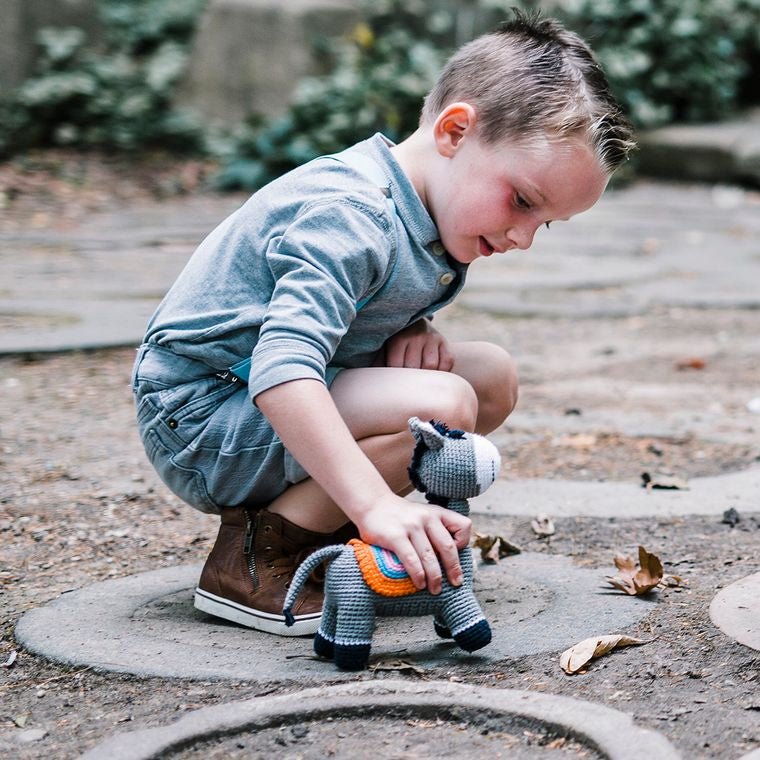 Donkey Rattle - Hee Haw! Perfect for hours of imaginative play, this delightful little donkey is ready to trot into a world of adventure with your little one. Featuring delicate little stitched details, this charming crochet rattle is handmade with soft cotton yarn and makes a gentle jingle while playing.
