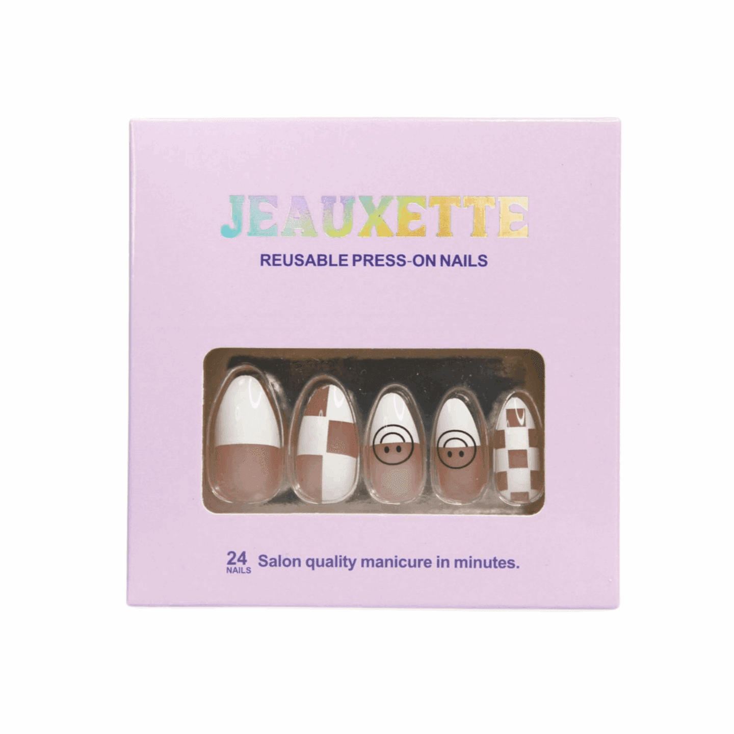 Let your nails do the talking with DORIS, the perfect press-on nails for anyone who loves playful patterns and fun accents. Featuring a chic brown and white checkered print with an adorable smiley face as the accent design, these almond-shaped nails are a blend of trendsetting style and cheerful charm.