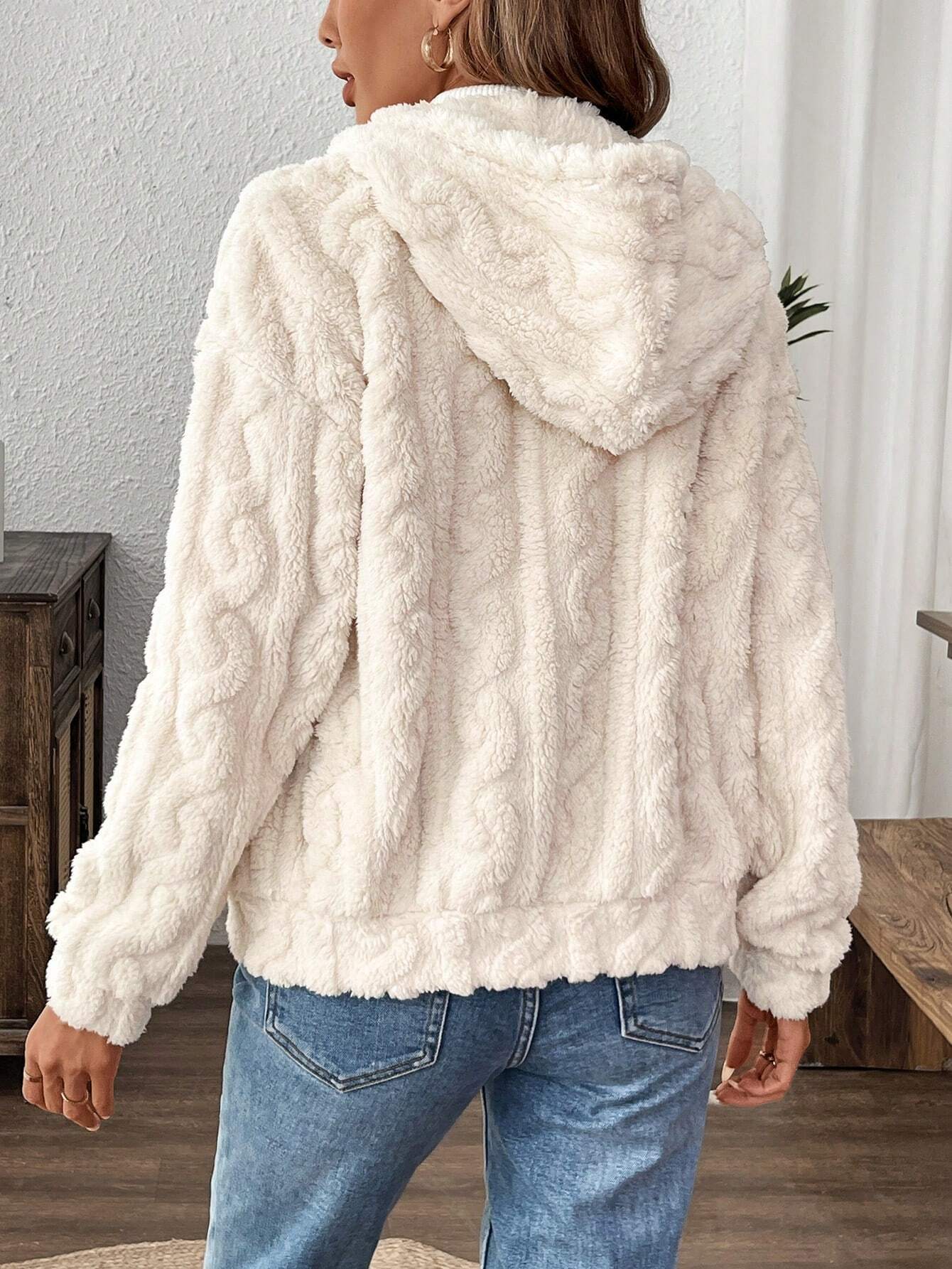 Double Sided Plush Drawstring Hooded Zip Cardigan Patch Pocket Cardigan Coat Women
