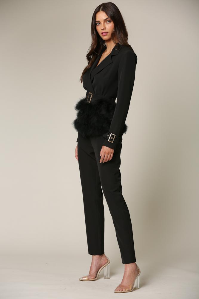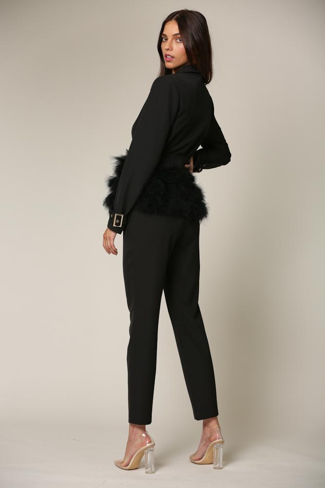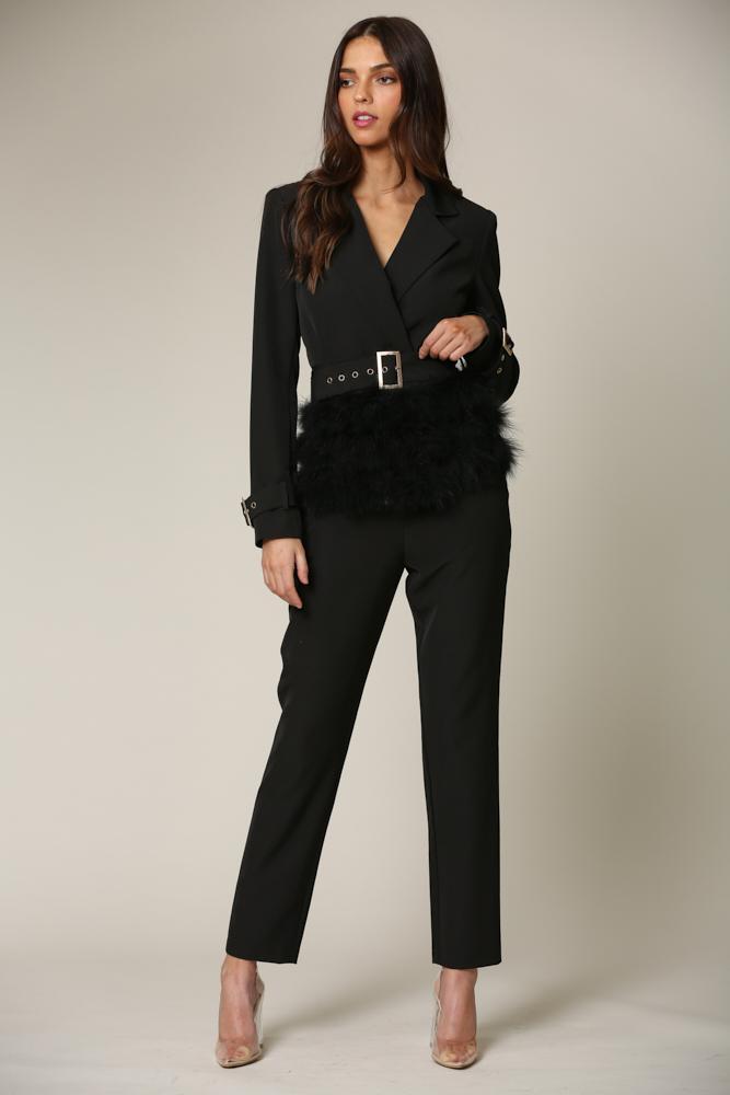 Features: A blazer + pant set featuring 3 tiered faux fur trim waist. Notched, lapel collar with hidden button closure. Buckle waist belt and sleeves. High-waist, tapered pant fit.