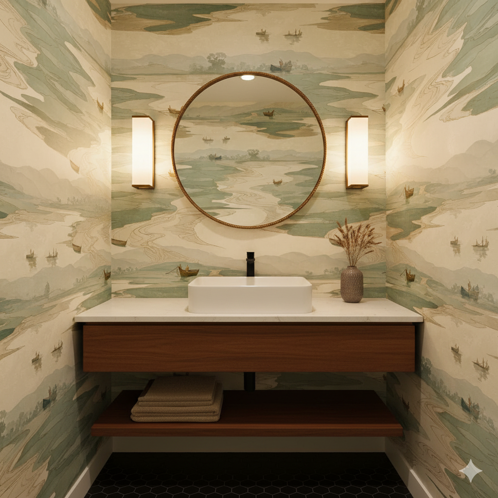 Inspired by classical Chinese scroll paintings, this design depicts winding rivers and distant mountains with delicate boats drifting across wide water surfaces. Rendered in washed jade greens, warm earth tones, and ivory, it feels timeless yet contemporary. The flowing currents and soft brush lines lend a meditative stillness, evoking journeys, trade routes, and ancient waterways. This wallpaper works beautifully in dining rooms, tea rooms, or boutique hotels that want to suggest refinement and heritage. Its horizontal rhythm expands a room, making walls feel wider and more open.