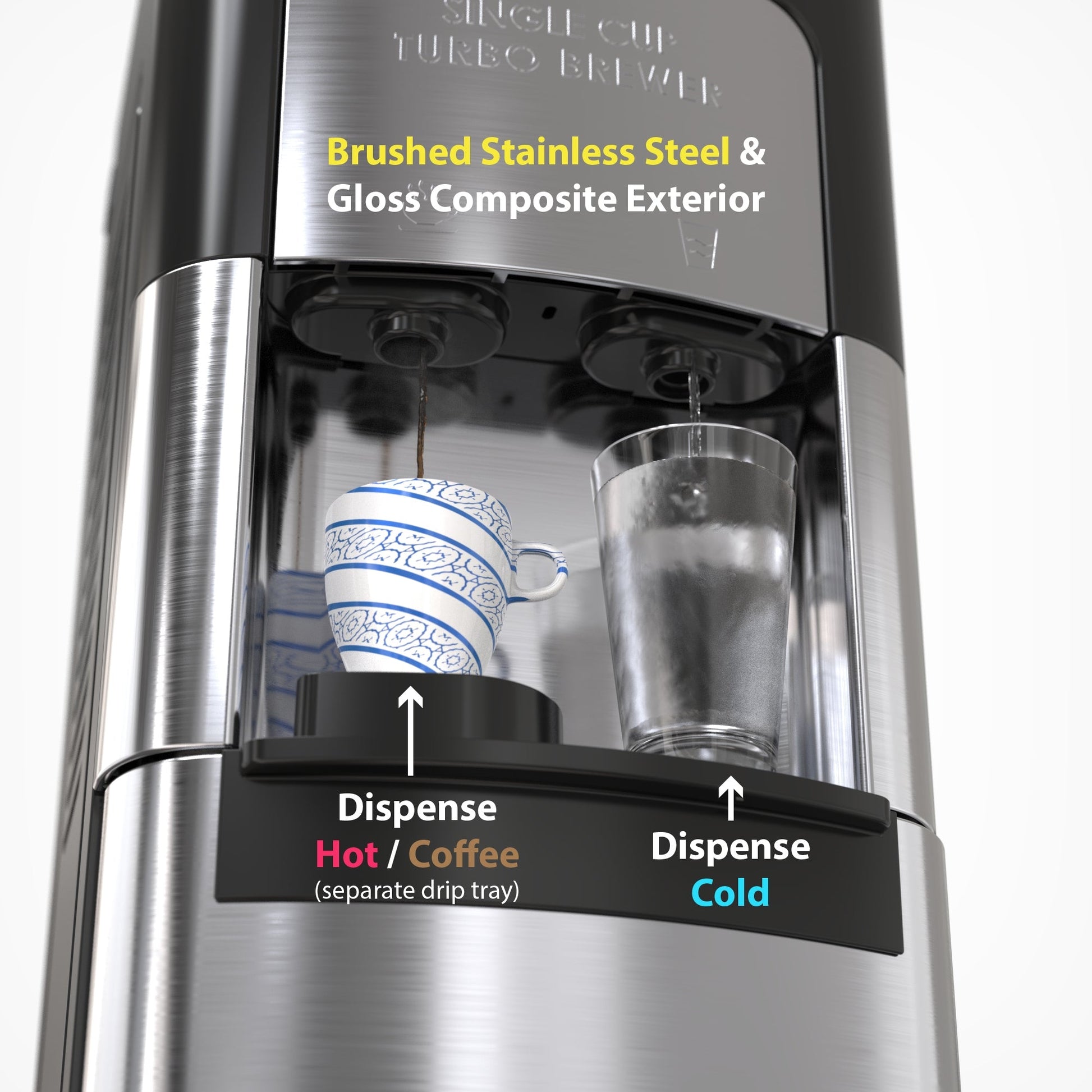 - TWO IN ONE: Enjoy the ease of drinking delicious cold or hot water, as well as brewing a piping hot cup of coffee with an integrated single serve coffee maker built inside the water cooler dispenser