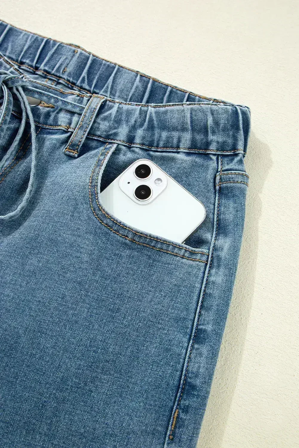 - Effortlessly chic, these jeans feature a drawstring waist for a customizable fit, perfect for casual outings or a day at the office.