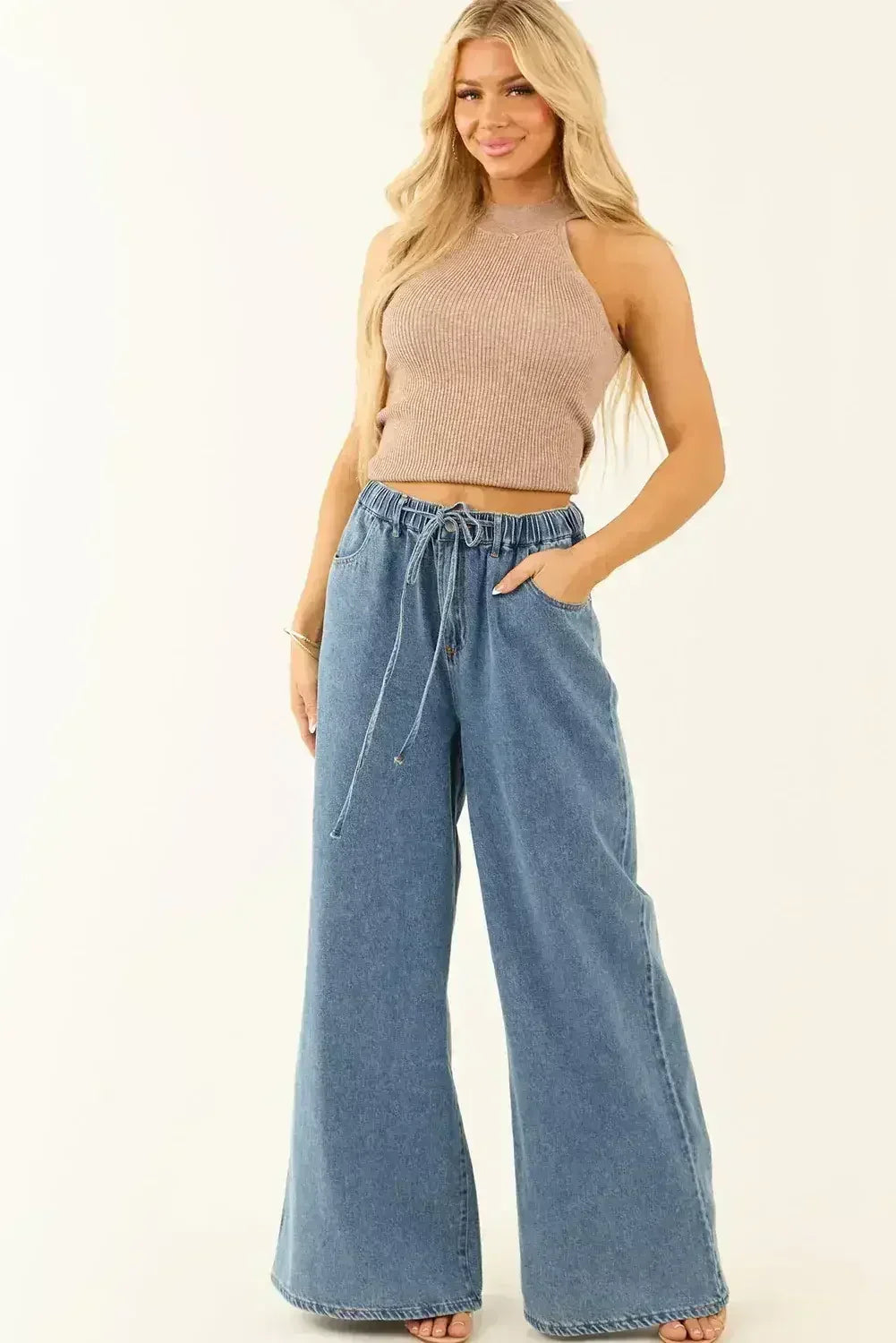 Dusk Blue Medium Wash Drawstring Waist Wide Leg Jeans