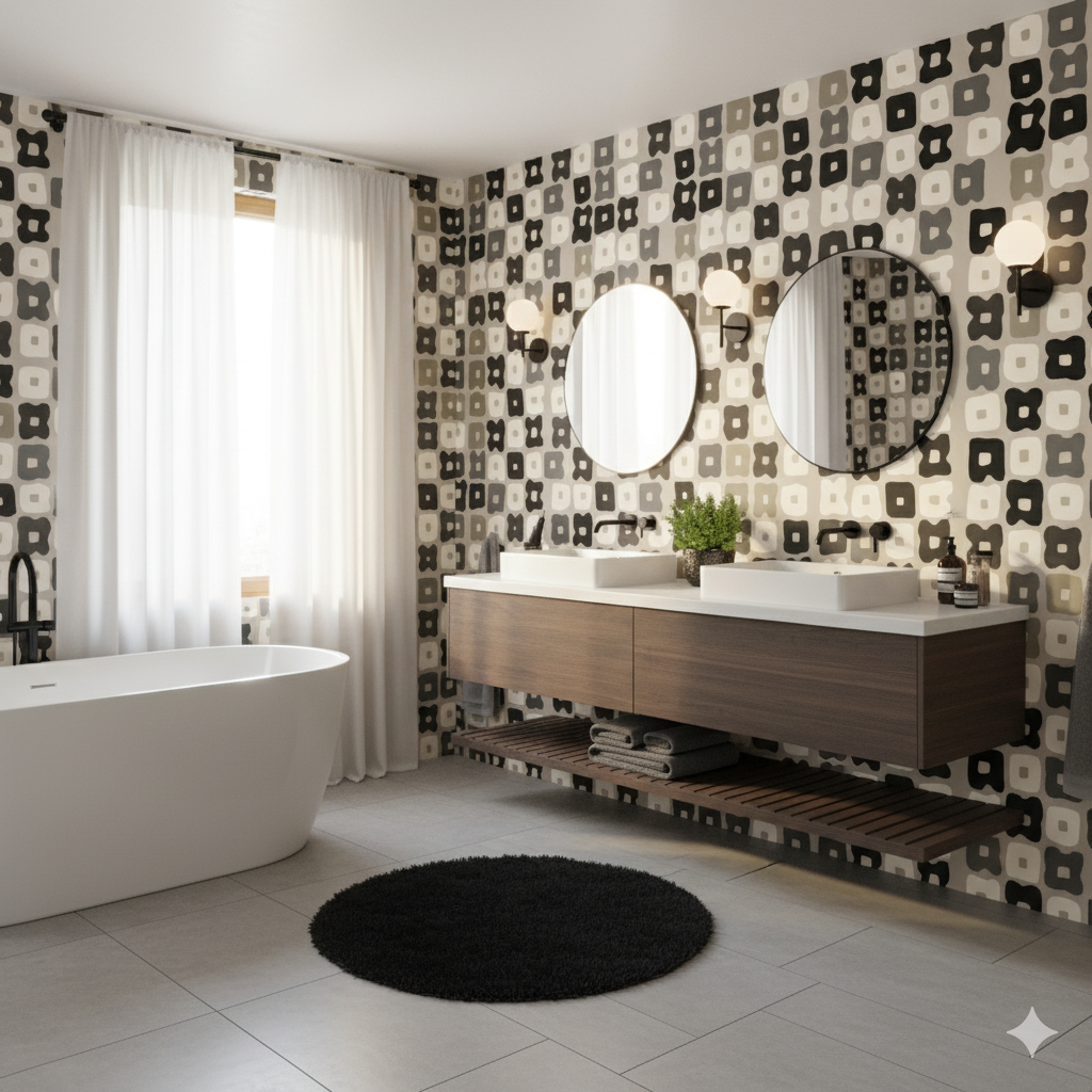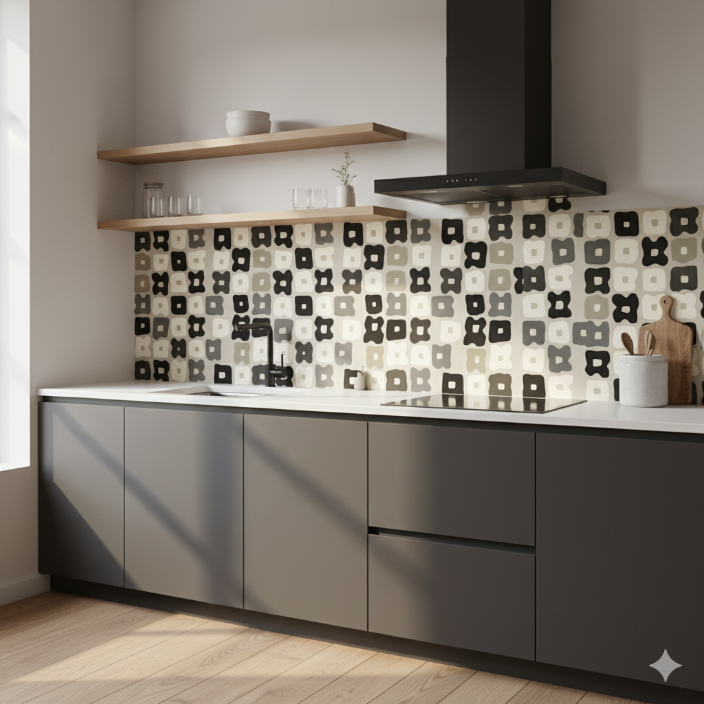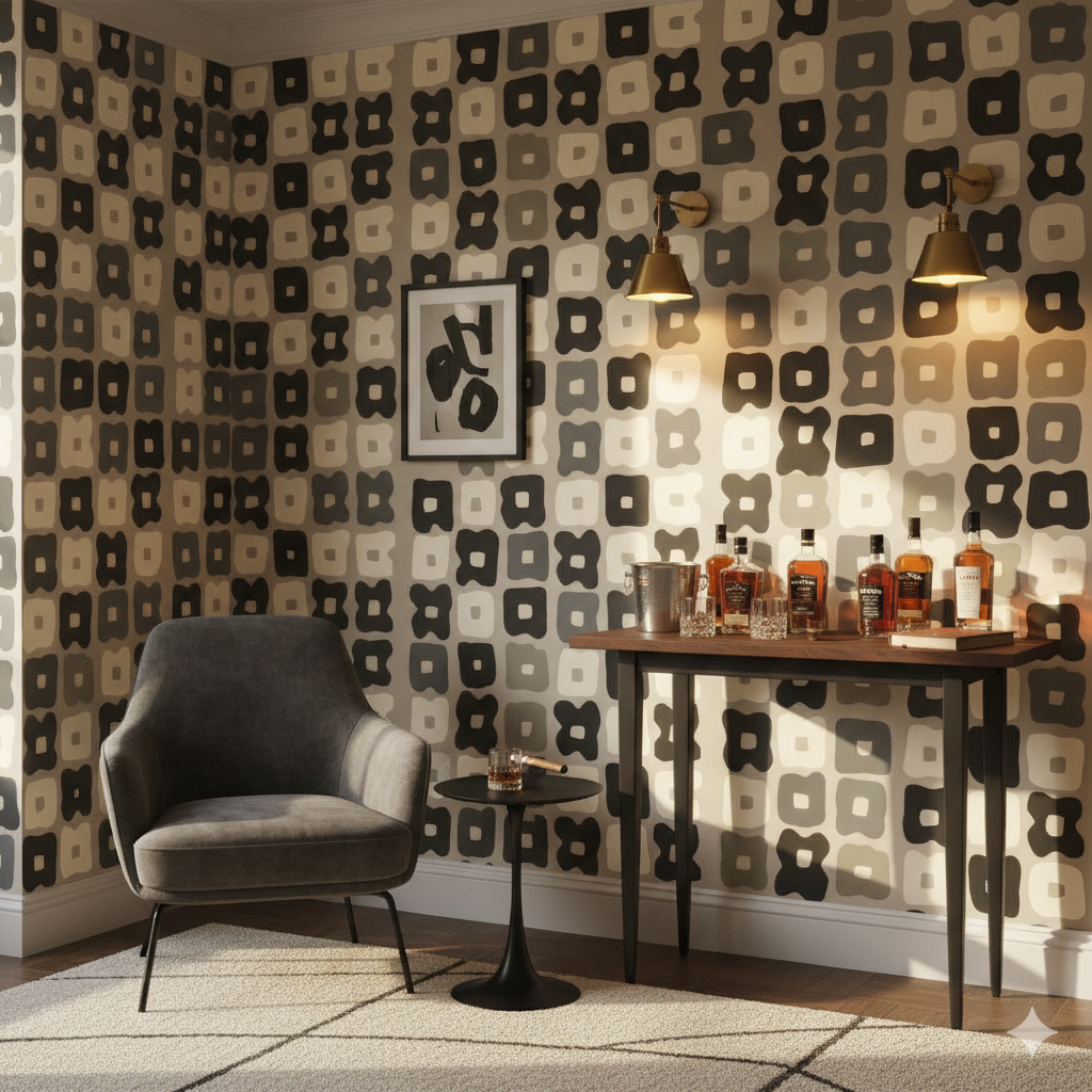 This pattern reinterprets cowhide patches into square, blocky motifs in muted tones of black, cream, taupe, and clay. The design has a midcentury modern-meets-ranch sensibility, bringing both geometry and ruggedness to a wall surface. It would suit a Southwestern kitchen, a rustic-modern cabin, or even a gallery wall backdrop where structure and earthiness are desired. The irregular forms keep it from feeling too rigid, adding warmth to its graphic composition.