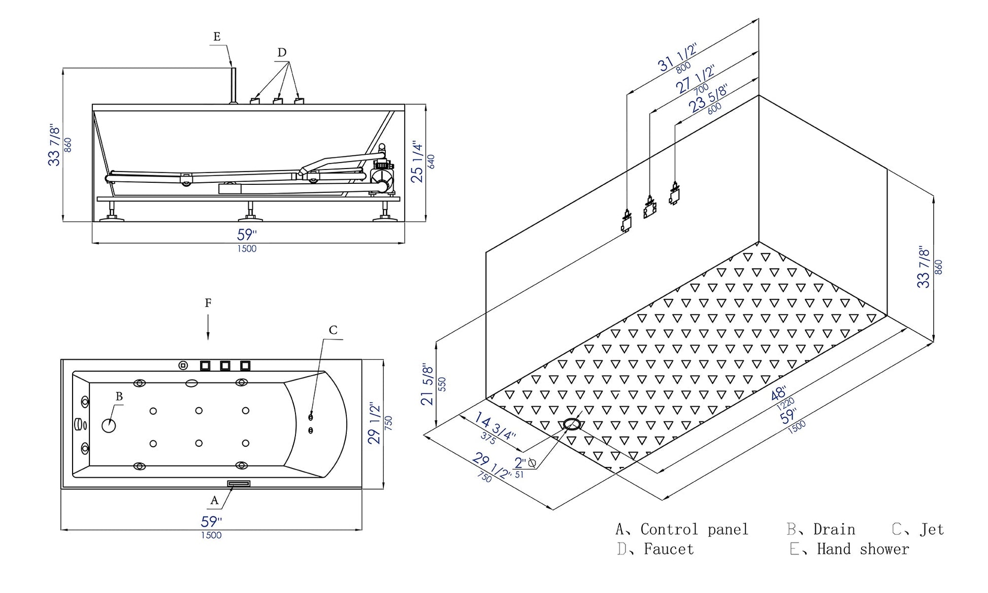 - The drain is located under the user's feet. The tub is 5 feet long. There is a larger 6 foot size also avaiable (Model # AM154ETL-L6). This tub is also available in a variant that enables the user to face the opposite direction (Model # AM154ETL-R5 and AM154ETL-R6)