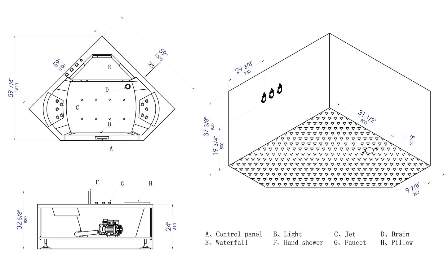 - Auto protection function for pump (if there is not enough water in the whirlpool bathtub the pump cannot be started) and 60 minutes auto shutdown function.