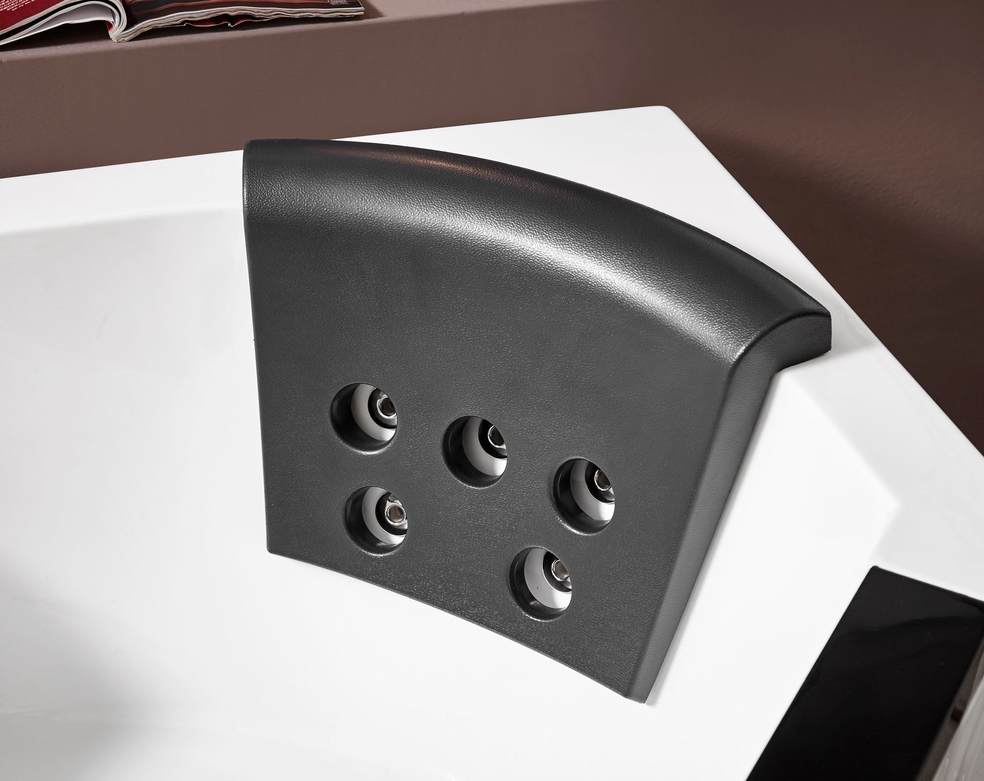 - Features a back flow preventer on the shower heads. This prevents residue or odor buildup. Includes 2 soft black pillows that stick to the tub with suction cups for an even more comfortable experience.