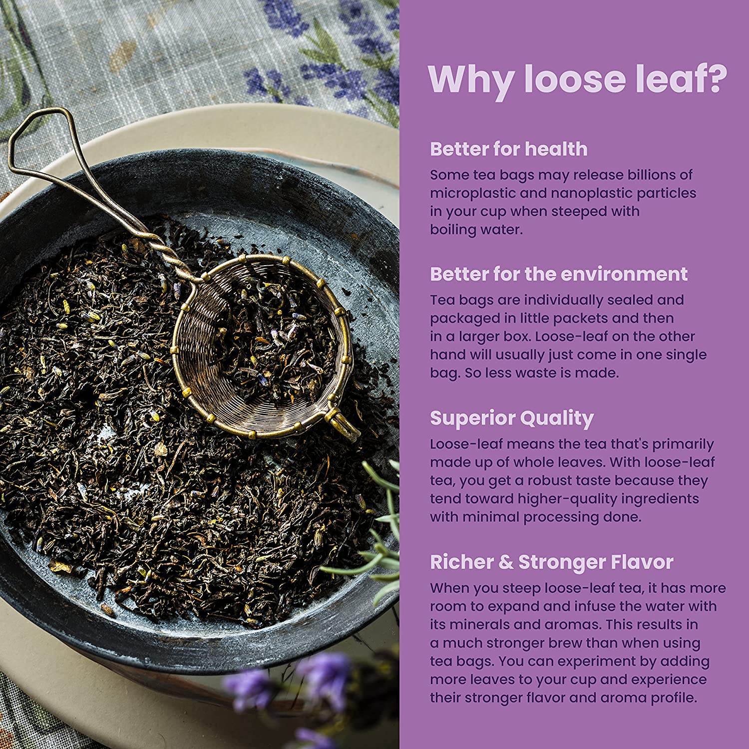 - EARL GREY LAVENDER BLACK TEA - Our organic loose leaf black tea will awaken your mind, body, and spirit and prepare you for the day ahead or be an excellent way to recharge in the afternoon. Our Earl Grey blend is like no other with only natural bergamot oil and expertly harmonized with the freshest and purest of natural lavender flowers. A truly noble and aristocratic blend