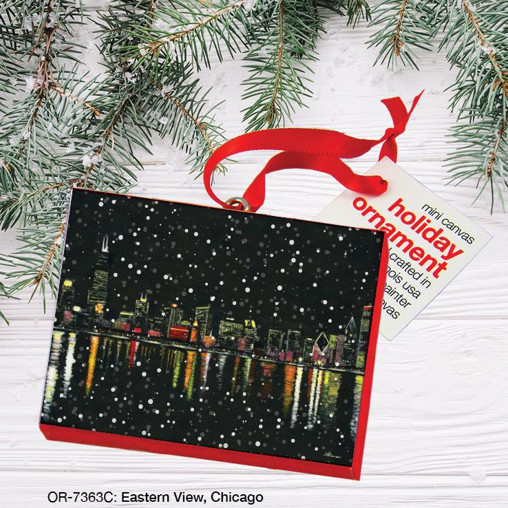 Eastern View, Chicago, Ornament (OR-7363C) is made in the USA from oil paintings by artist, Danilo Cuevas. Miniaturized images mounted on a mini canvas. Each arrive with a red ribbon strand for easy hanging and display.