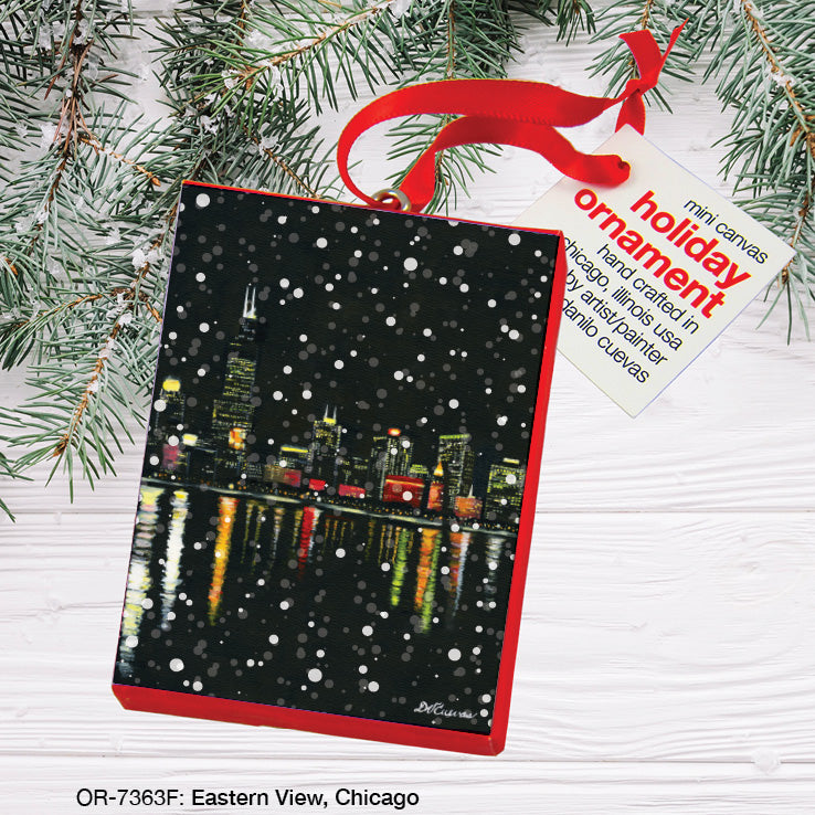 Eastern View, Chicago, Ornament (OR-7363F) is made in the USA from oil paintings by artist, Danilo Cuevas. Miniaturized images mounted on a mini canvas. Each arrive with a red ribbon strand for easy hanging and display.