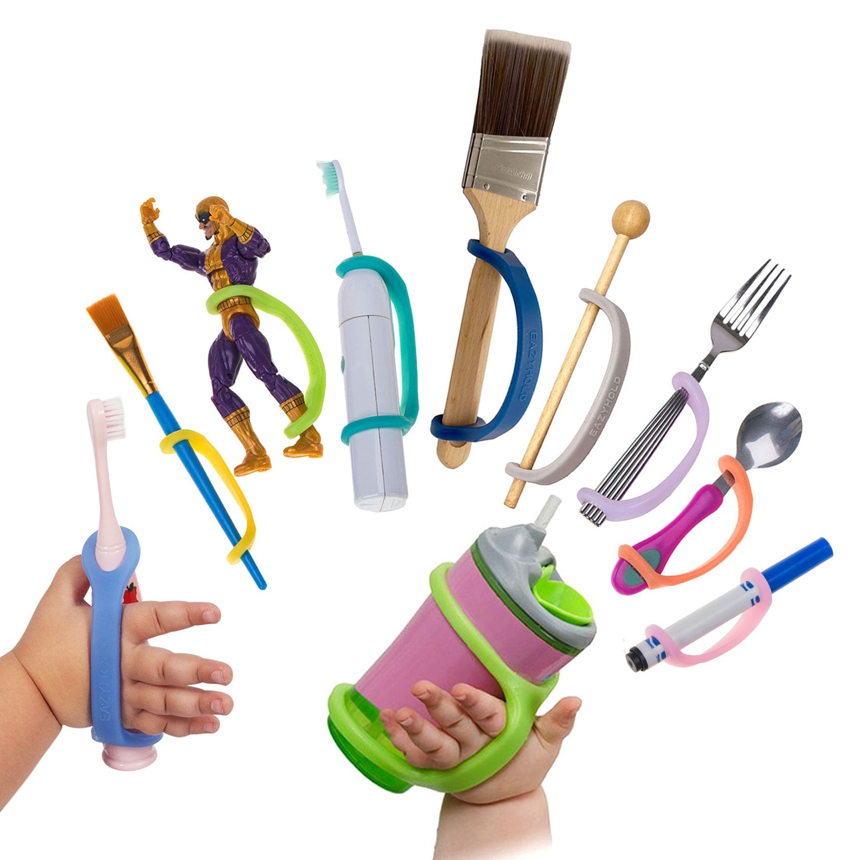 For Eating and Drinking For childrens to adults hands and limbs, EazyHolds ergonomic design enables those with conditions such as cerebral palsy, arthritis, limb differences, tremors, spinal cord injuries, and motor delays to easily hold and control objects of daily living.