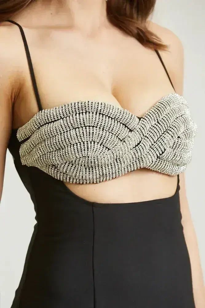 DRESS- SOLID WOVEN FABRIC- ADJUSTABLE SHOULDER STRAPS- RHINESTONE EMBELLISHED TWIST TRIM BUST- STRAIGHT LINE SILHOUTTE- METAL CLASP AND ZIPPER CLOSURE- SLIT BACK HEM- 77% POLYESTER 17% RAYON 6% SPANDEX