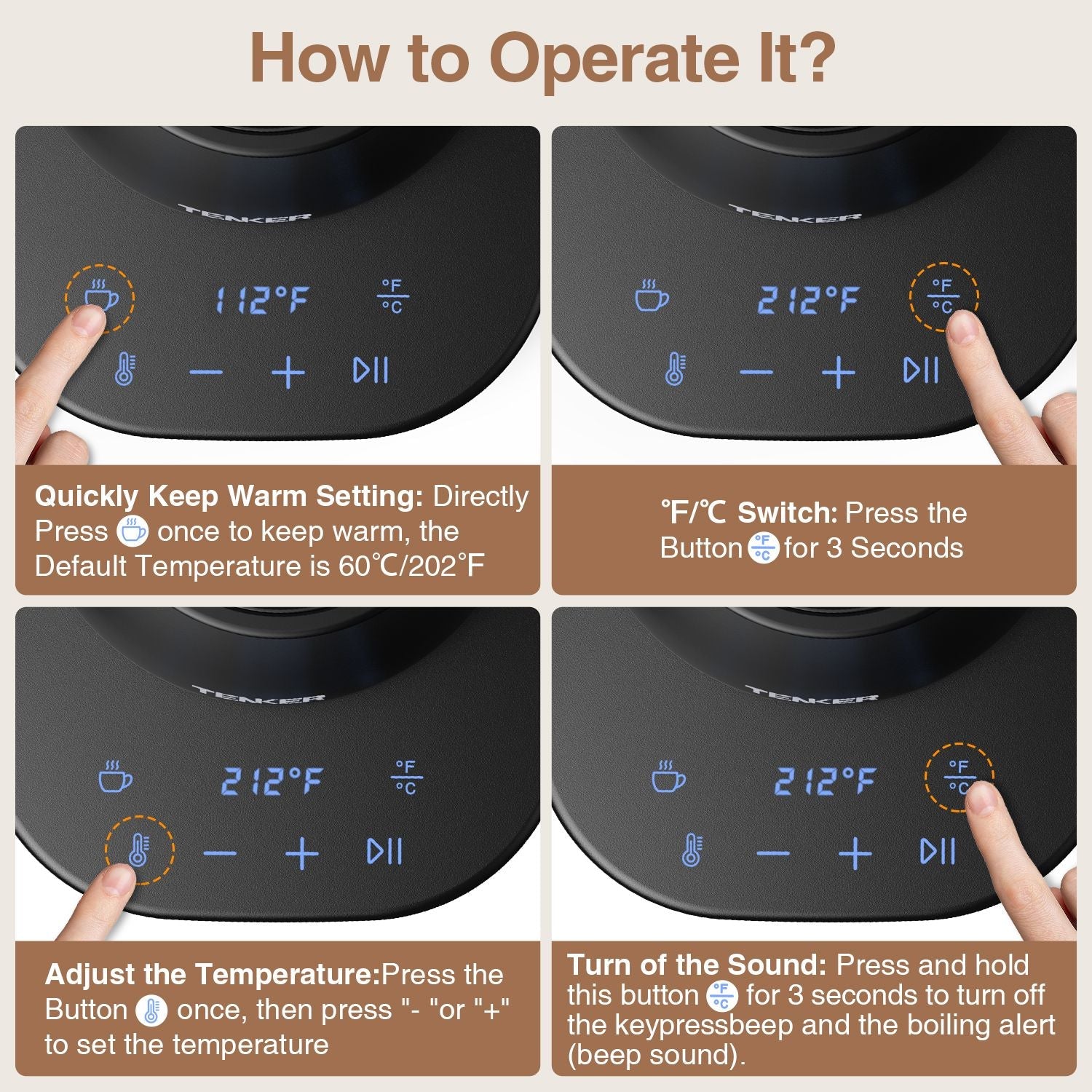 ±1°F Temp Regulation: TENKER electric gooseneck kettle enables 1°F temperature adjustment within a broad span from 104 to 212°F. The built - in LCD panel shows real - time and target water temperatures. 5 Temperature Presets satisfy the requirements of different beverages, like Black tea, Coffee, Oolong, Green tea, White tea.