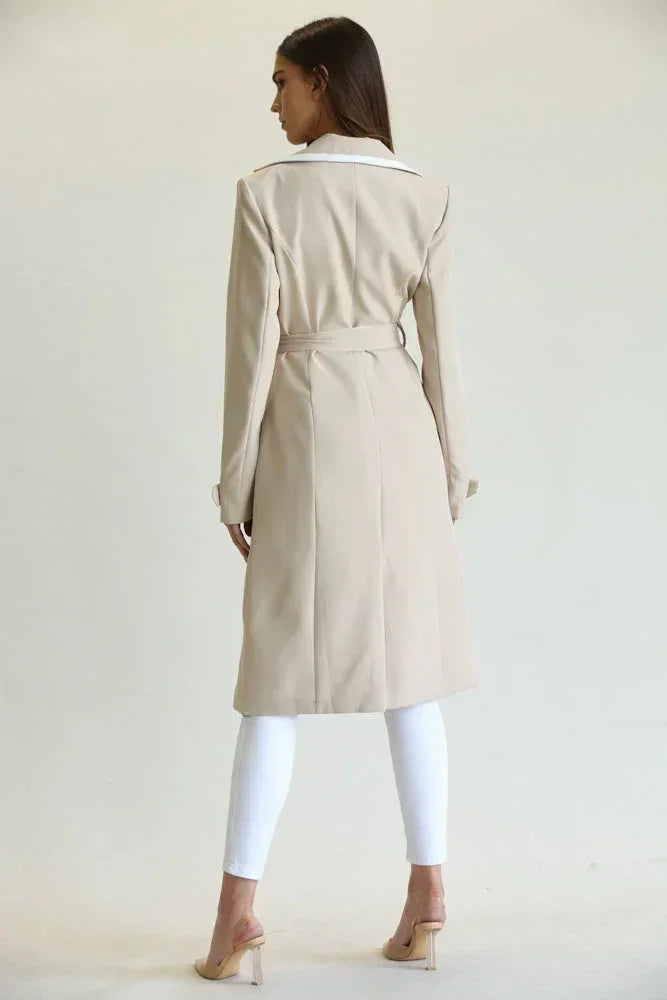 - DOUBLE-BREASTED GOLD BUTTON FRONT CLOSURE