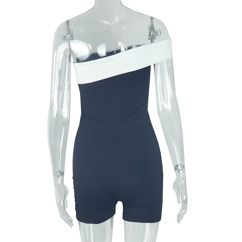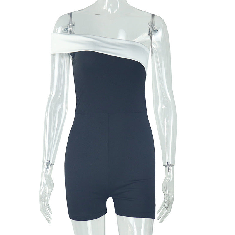 Elegant Women Black White Contrast Color Fit Tube Top Jumpsuit Oblique off Shoulder Raglan Sleeve Jumpsuit