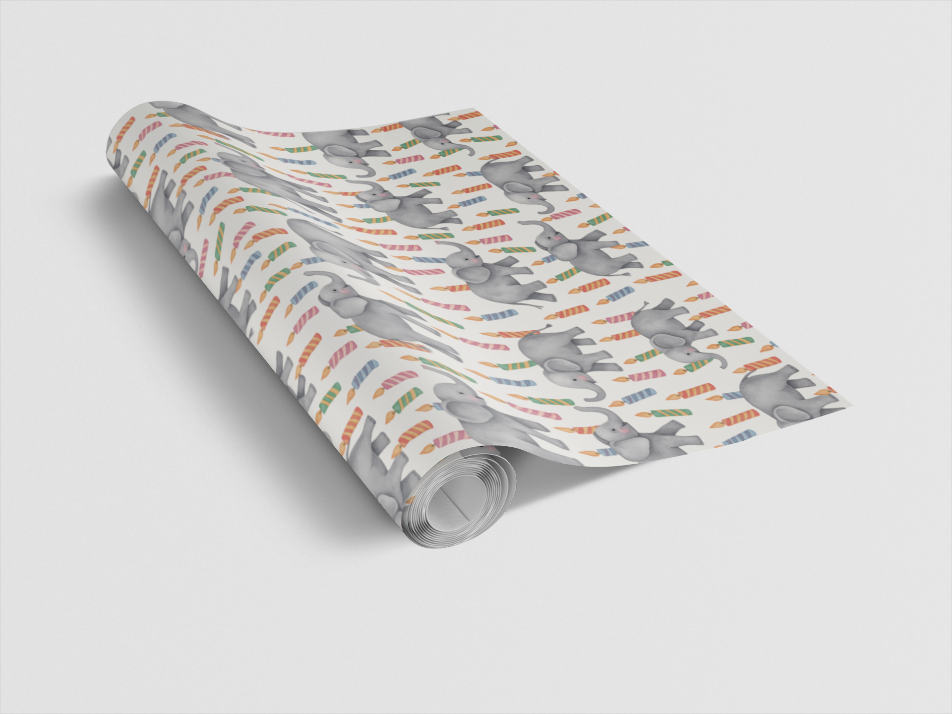 Elephant Birthday Bashis a playful wrapping paper featuring cheerful gray elephants surrounded by colorful, striped birthday candles. The lively design brings together fun, festivity, and a touch of whimsy, making it perfect for celebrating special days. Ideal for kids’ parties or anyone young at heart, this wrapping paper turns every gift into a jumbo-sized celebration.