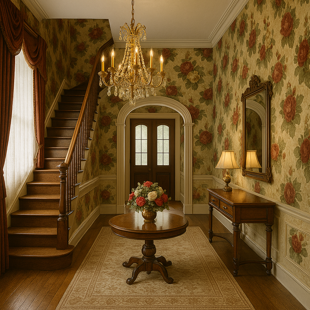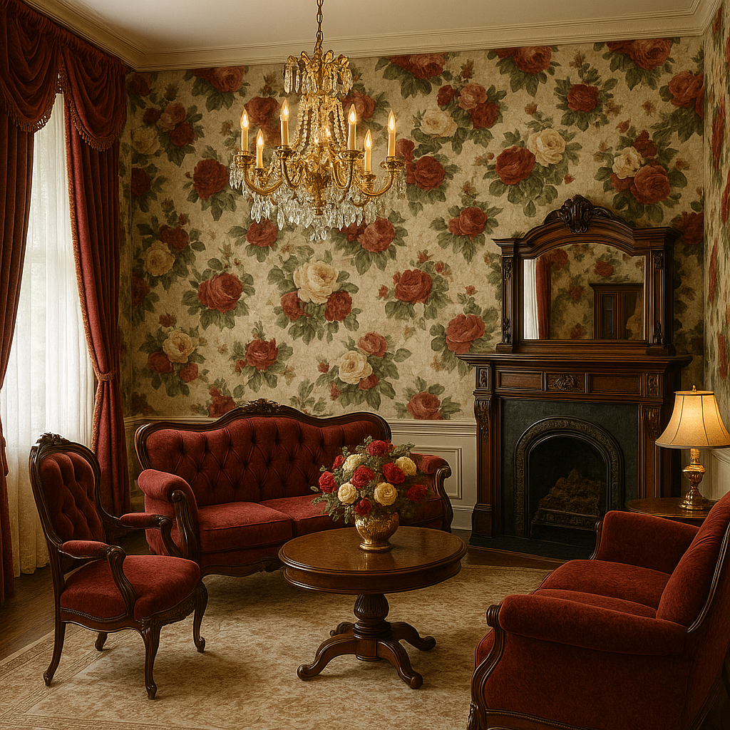 "English Rose Tangle" is a dense explosion of traditional garden roses in full bloom, layered across a canvas of twilight mauve, faded coral, and classic green. With vintage charm and dramatic depth, this floral wallpaper evokes an overgrown English estate—ideal for romantic bedrooms, statement powder rooms, or any space that longs for decadent nostalgia.