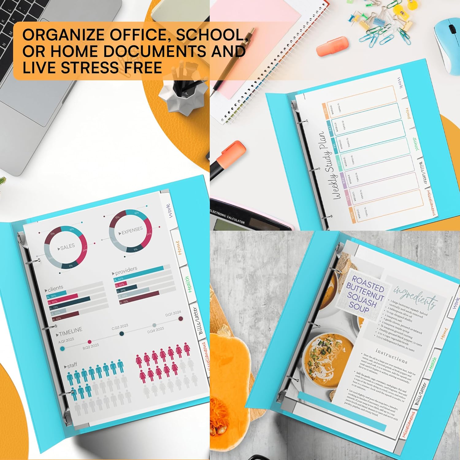 The professional three ring page dividers allows you to conveniently categorize your personal organization at work, home and school.