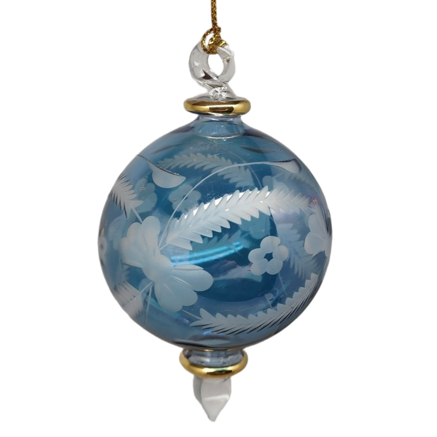 This enchanting globe ornament captures the crisp elegance of a winter’s dawn in a delicate powder-blue hue. Mouthblown from German Pyrex glass by master artisans in Egypt, its smooth surface is etched with dancing sprays of leaves and blossoms that glisten like frost along a windowpane. Gleaming 24K gold rings at the top and base lend a warm metallic contrast, while a clear teardrop finial adds a graceful finishing touch. The combination of soft blue and gold makes this piece a serene yet sophisticated accent for any festive display.
