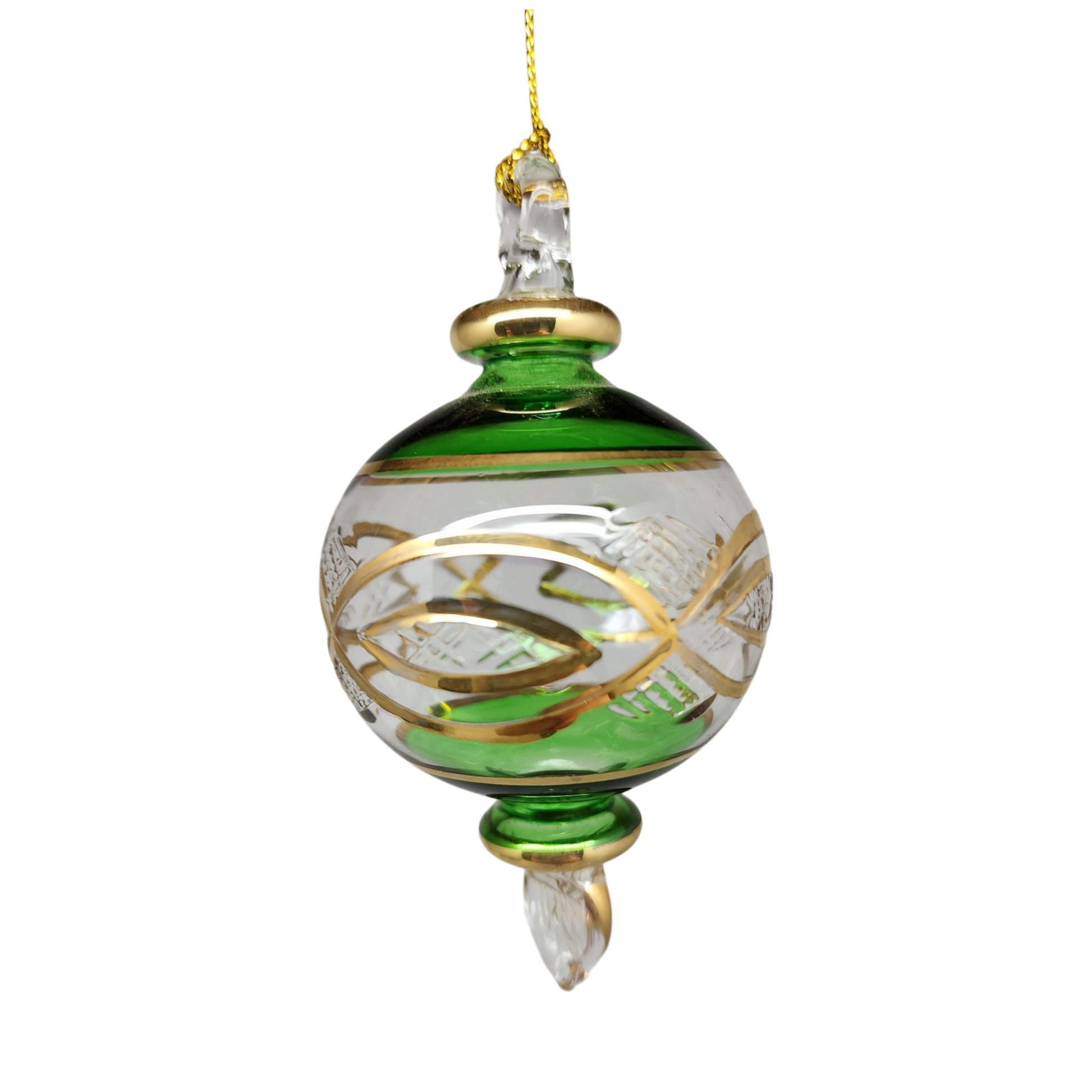 Transform your holiday display with our enchanting mouth-blown glass ornament, standing at just under 4 inches tall. This stunning piece is meticulously crafted in Egypt, showcasing the skilled artistry and rich traditions of glass-making. Accented with genuine 24K gold, this ornament dazzles with its vibrant green hues and intricate designs that dance in the light, making it a splendid addition to your festive decor.