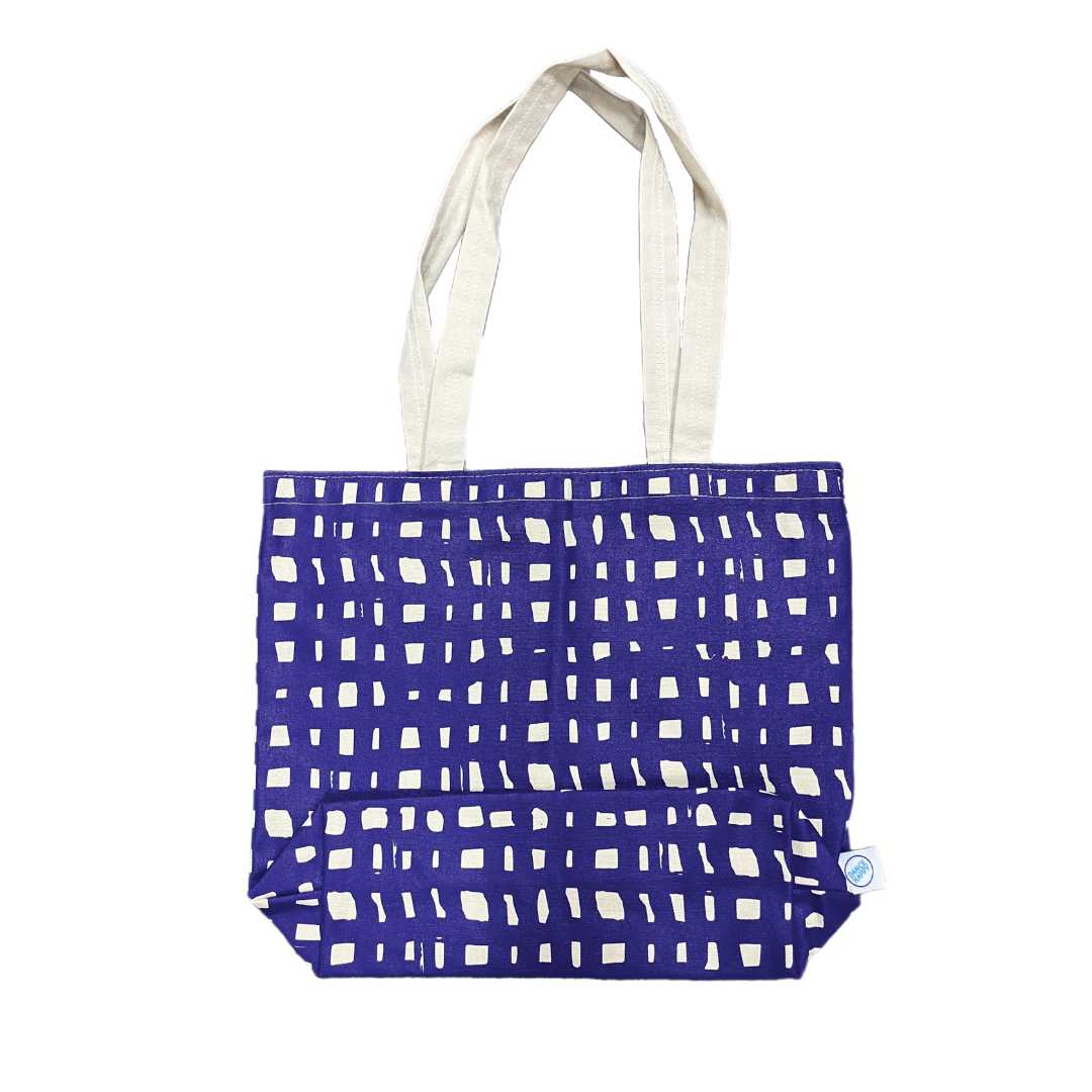 Market style tote bag with a bottom gusset that features a handcut grid pattern screenprinted in royal purple. These totes are hand printed and sewn by Fair Trade.