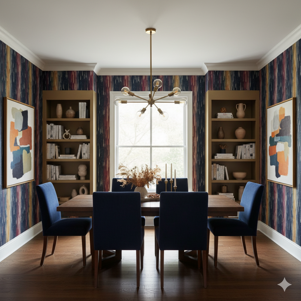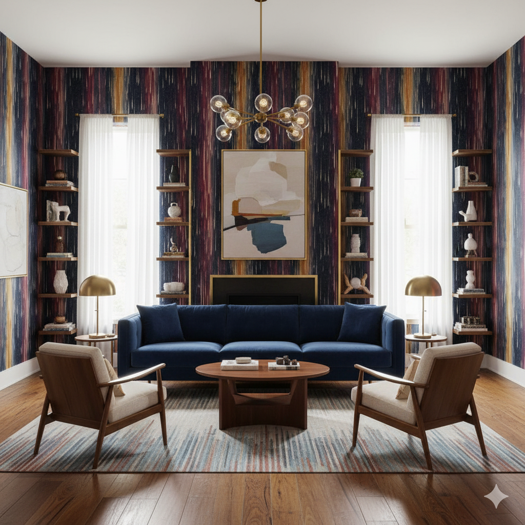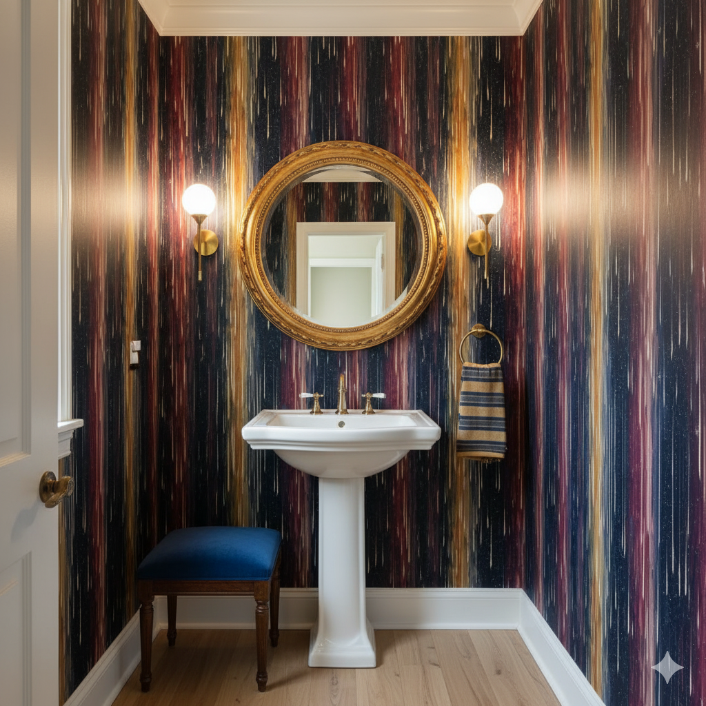 Vertical bands of deep crimson, ochre, violet, and midnight blue streak downward like endless showers of meteors. Each brushstroke carries energy and gravity, evoking the sensation of standing beneath a sky alive with movement and burning color. The black backdrop speckled with tiny stars amplifies the drama, giving walls a sense of constant falling motion. This design works beautifully in tall spaces such as entryways, stairwells, or modern living rooms, elongating the perception of height. It’s especially striking in moody interiors where dark wood, matte black accents, or jewel-toned fabrics are used, creating an atmosphere that feels both celestial and cinematic.