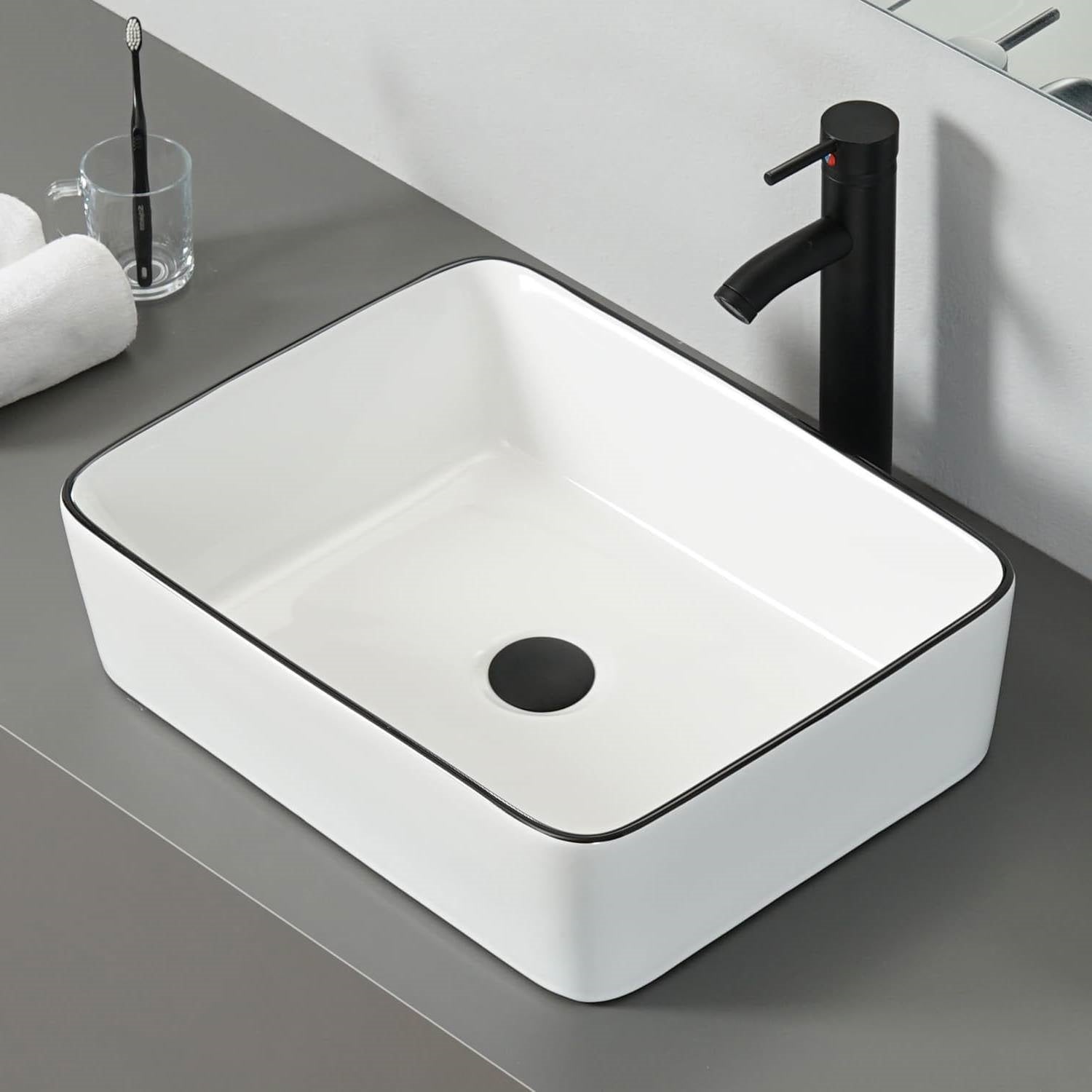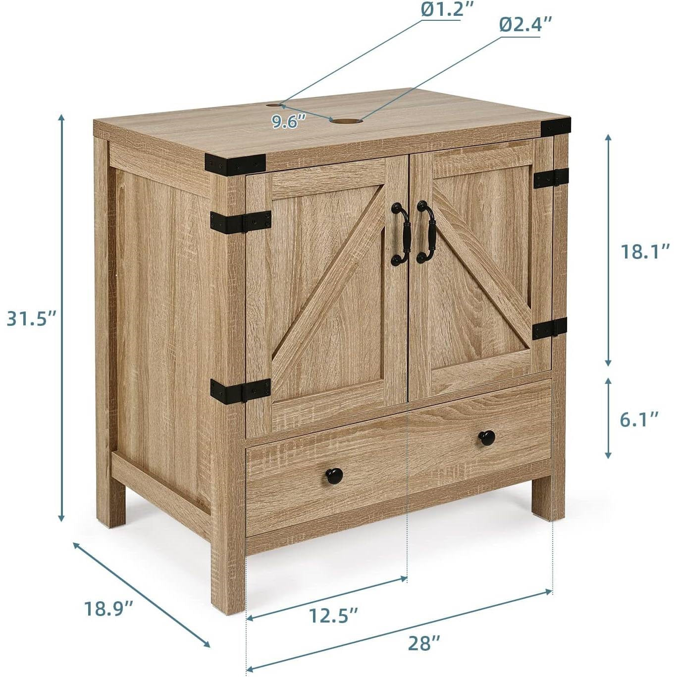 This Farmhouse Wood Finish Bathroom Vanity with White Sink - Black Faucet and Drain is made of Eco-MDF wood for long-lasting durability. Careful Coverage and Eco paint enable durability. Cabinet: 19"x 28"x 31.5"(D×W× H); Sink dimension: 19" L x 15.2'' W x 5.3'' H; Bowl thickness: 0.5". Scratch-resistant & Polished surface is easy to clean up. Comes with Vanity, Ceramic sink, Black Faucet, Pop up drain, Hot/ cold lines, and some mounting hardware. Modern and stylish design fit perfectly with most bathroom decor; Easy installation.
