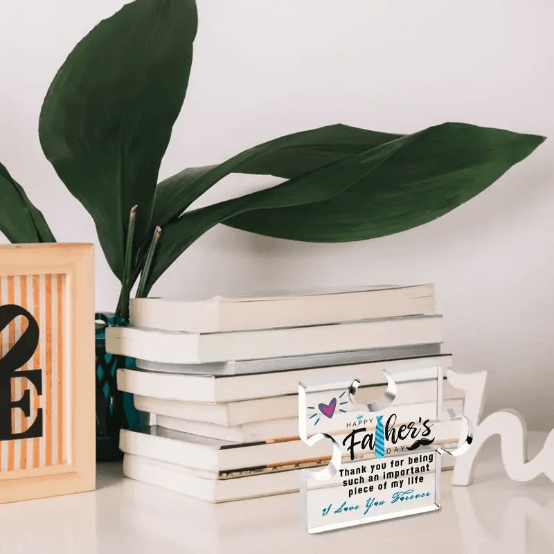 Show your love and appreciation this Father's Day with our beautifully crafted Heartfelt Acrylic Puzzle Plaque. Designed with care, this elegant piece features a clear, high-quality acrylic puzzle shape engraved with the touching message: "Happy Father's Day – With Love & Gratitude."
