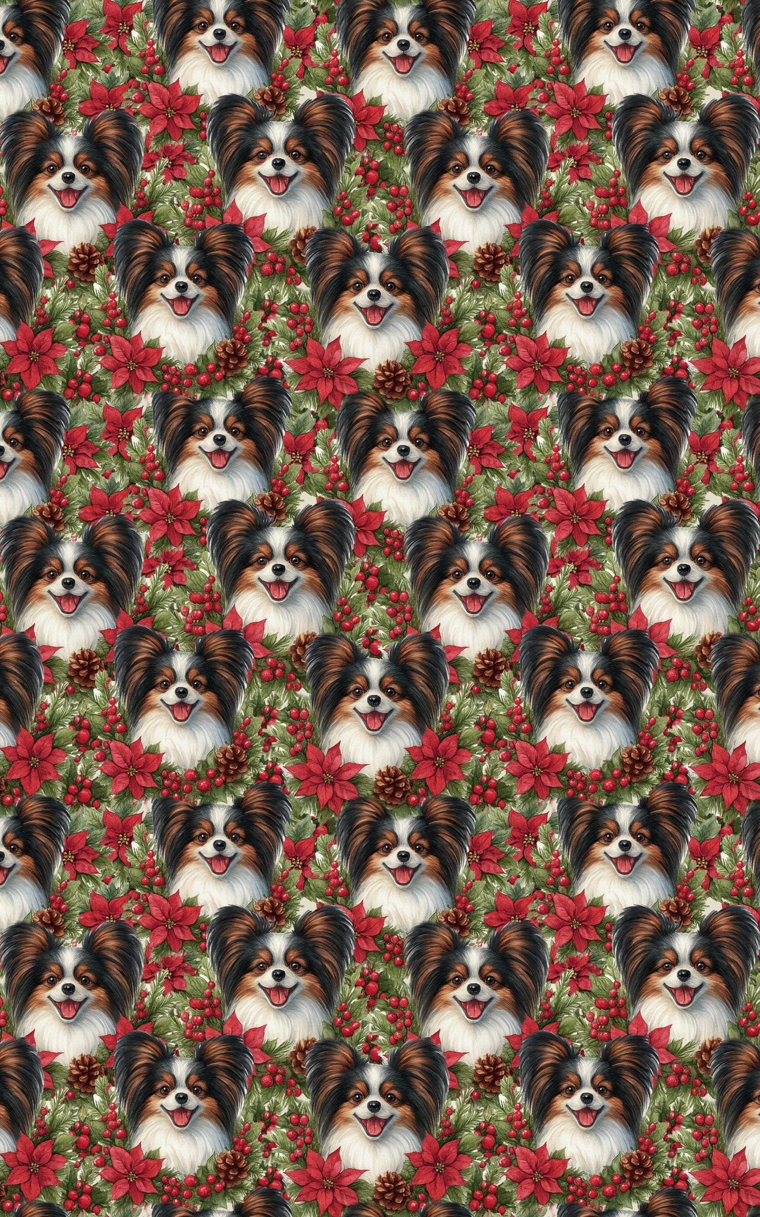 Whispered Wings and Winter Blooms (Papillon) Light as a snowflake and joyful as carols in the air, the Papillon flutters into the holidays with delicate grace and boundless cheer. This festive wrap celebrates their bright spirit and loving heart—playful, alert, and forever charming. Every fold carries the sparkle of holly-tipped mornings and the gentle warmth of a loyal friend who brings magic to every moment.