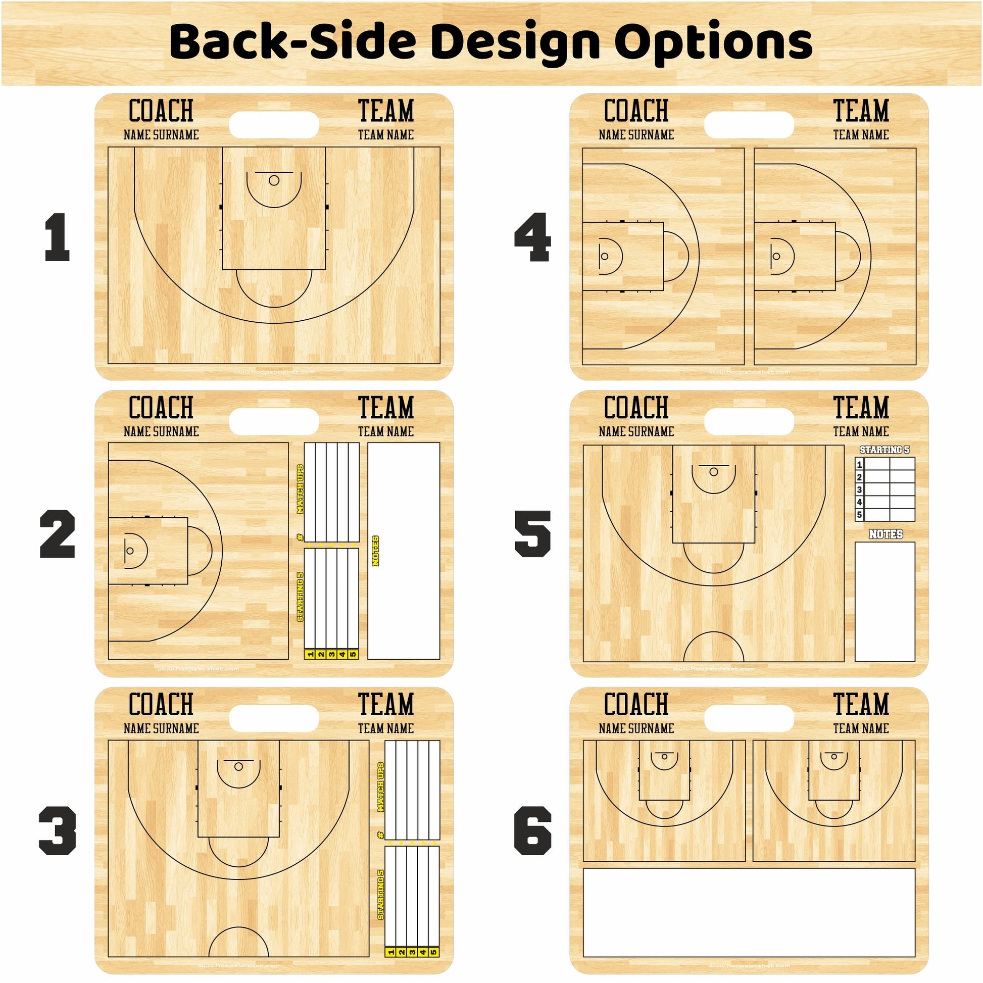 There are 6 different options for the back-side of your coaching board. Please keep in mind that all coaching boards are customizable, both the front and the back sides of the basketball clipboard.