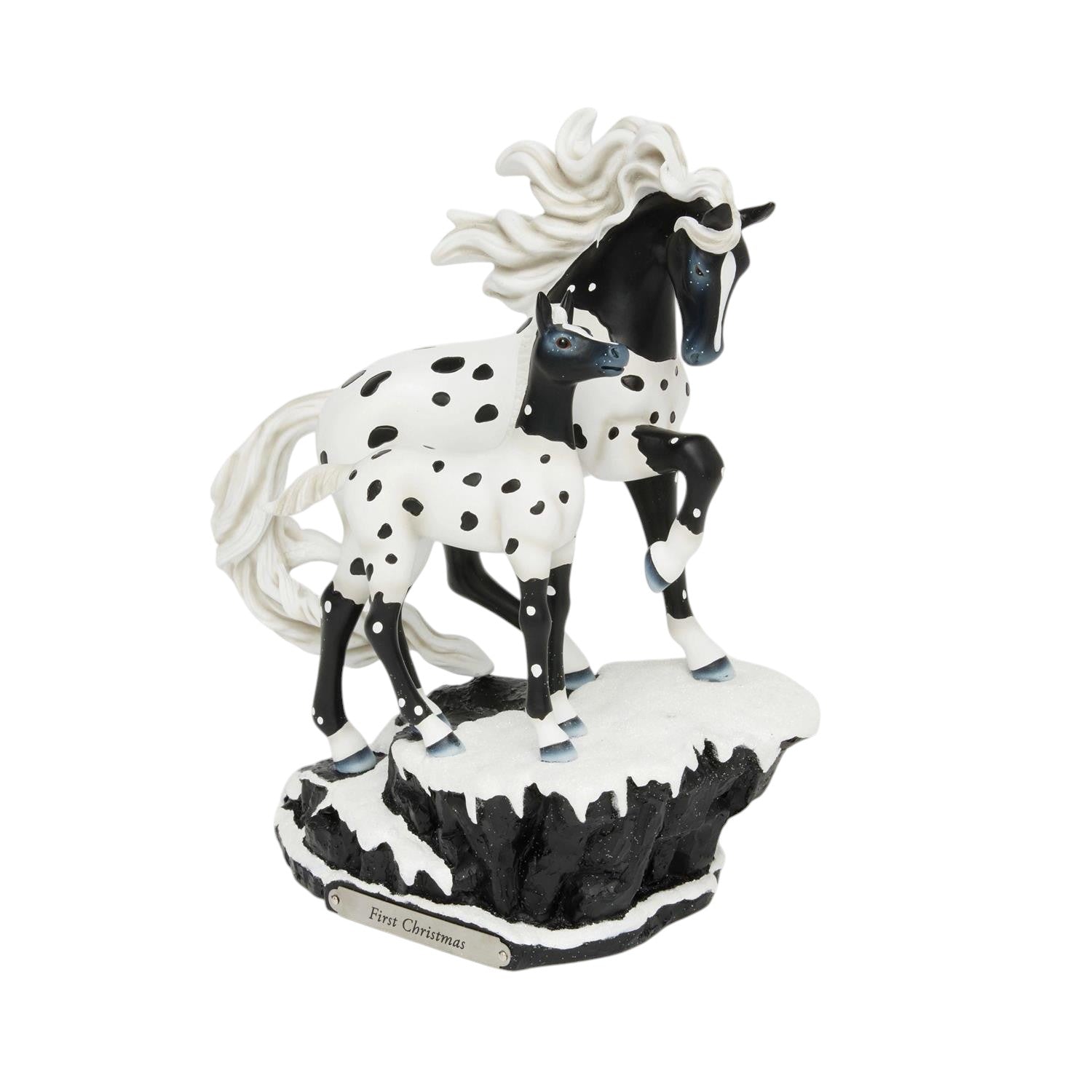 Celebrate the wonder of new beginnings with this enchanting figurine from the Trail of Painted Ponies Collection, titled "First Christmas." Standing at 9 inches tall, this beautifully crafted piece features a striking black and white mare alongside her precious foal, both adorned with a captivating design that symbolizes the joy and innocence of the holiday season. The intricate detailing and serene expressions of the horses embody love, protection, and the magic of their very first Christmas together.