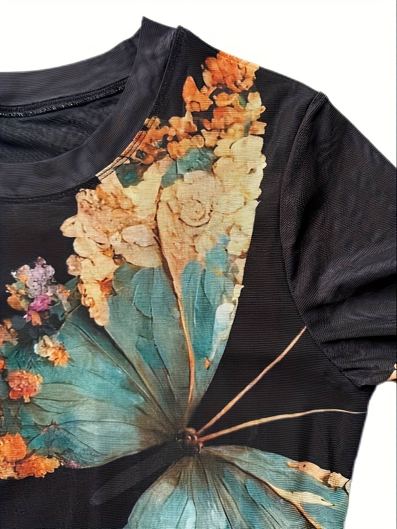 Floral Butterfly Print Women’s Tulle Top Long Sleeve Semi-Sheer Shirt