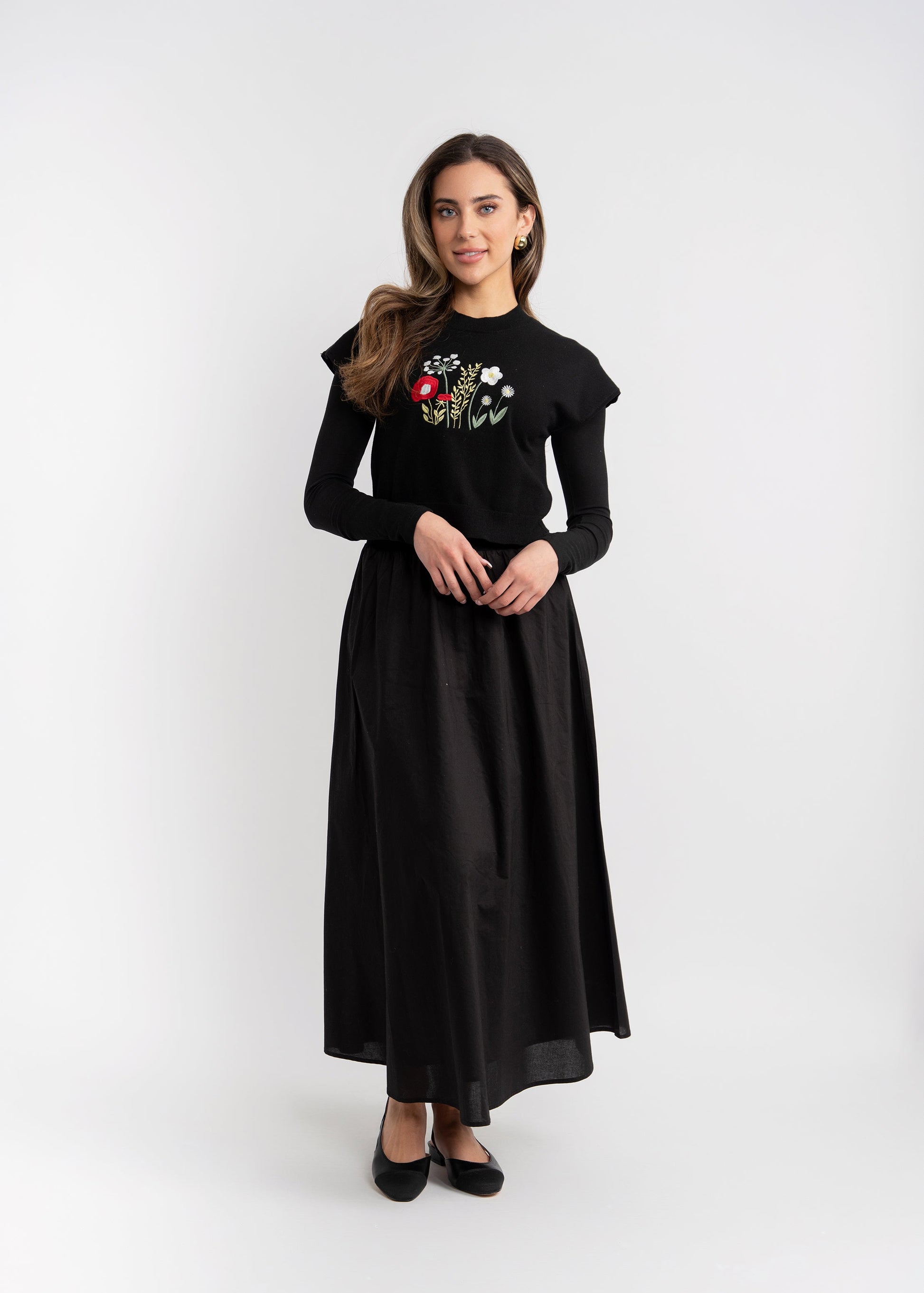 Teens floral embroidered stitch knit cropped vest with center floral embroidery , ribbed cuffs and hemband.ֲ